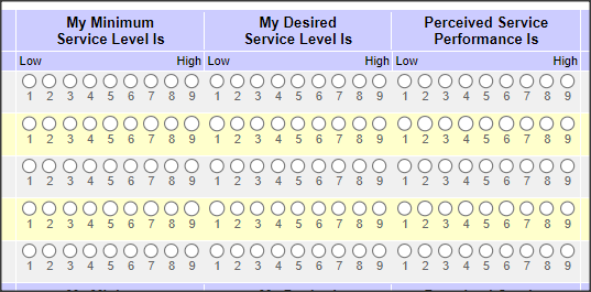 On each axis, respondents’ minimum, desired, and perceived levels of service quality are plotted, and the resulting “gaps” between the three levels (representing service adequacy or service superiority) are shaded in blue (perceived greater than minimum) and yellow (perceived less than desired).