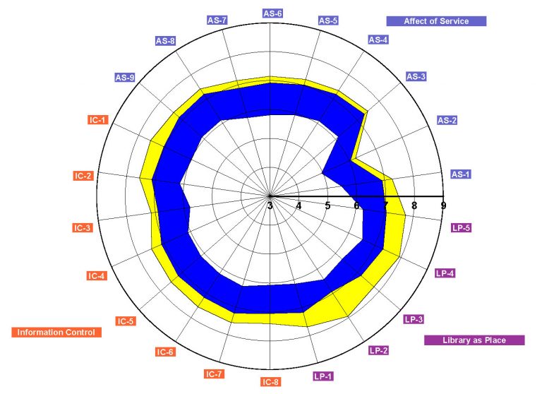 This radar chart shows the aggregate results for the 22 core questions. Each axis represents one question. They are grouped into sections: Affect of Service, Information Control, and Library as Place.