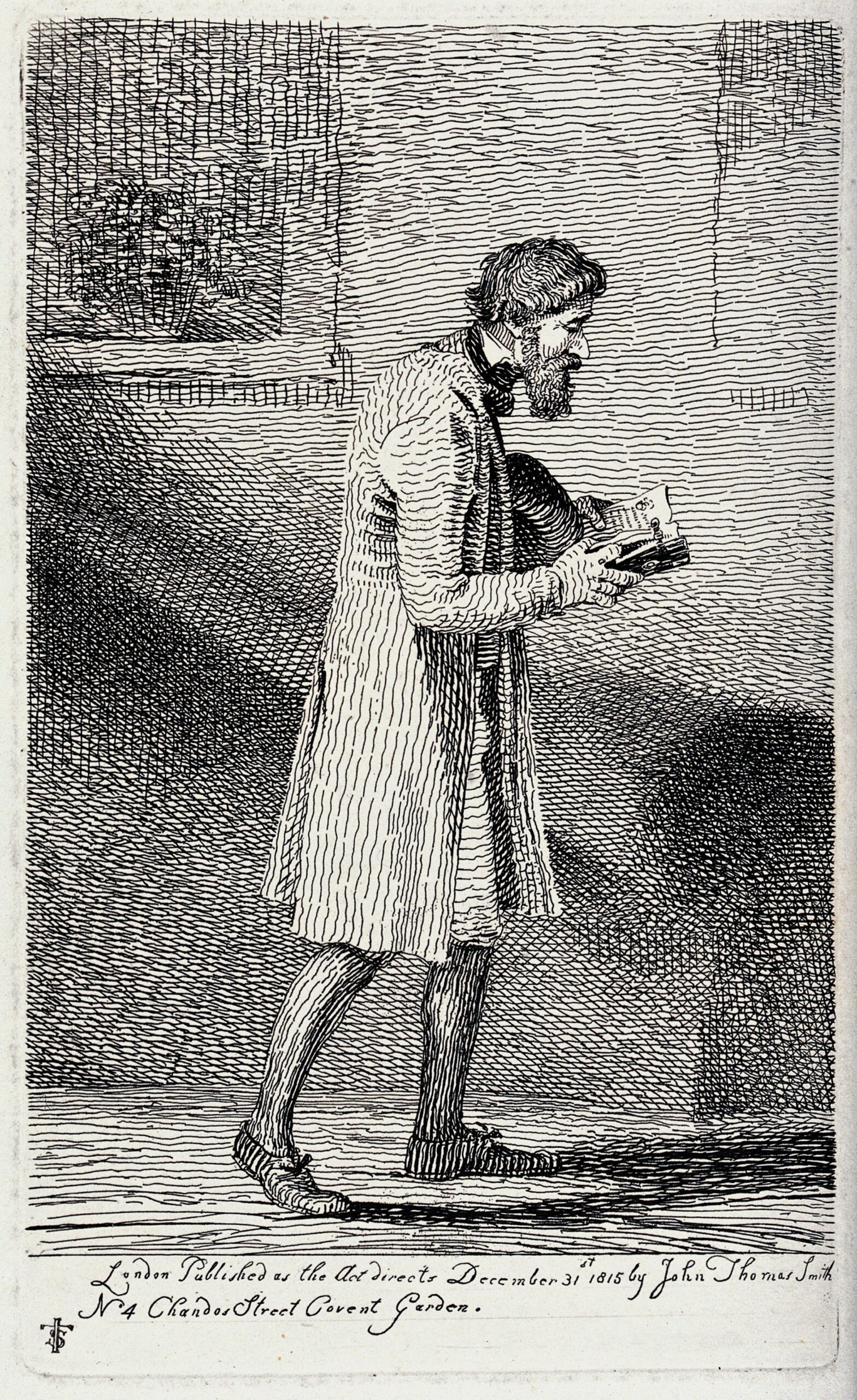 A bearded man walking the streets with his hat under his arm