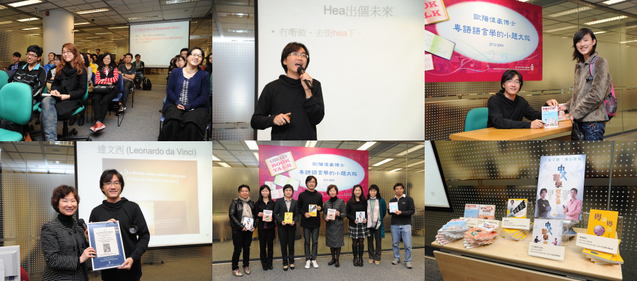 歐陽偉豪博士將會介紹他四本書各自的主題,即《粵講粵法》、《撐廣東話》、《中英大不同:語法解密》、及《中英大不同2:錯了就「火羅」爆的語法問題》。當中涉及很多有趣的語法特點,例如粵語俗話如何滲入數字組合;標語格式「小心XX」如何在香港譯成英語等。其實,這些不同的著作均指向同一目標,就是藉粵語提高讀者的語言自覺,及喚醒他們對文法及語法的關注。歐陽博士於科大畢業後一直在中大任教,閒時思考如何在香港推廣粵語的跨學科研究與應用。正當上述四本小書踏出推廣的一小步時,另一本跨學科的著作最近也出版了,名為《中文數學交叉點》。