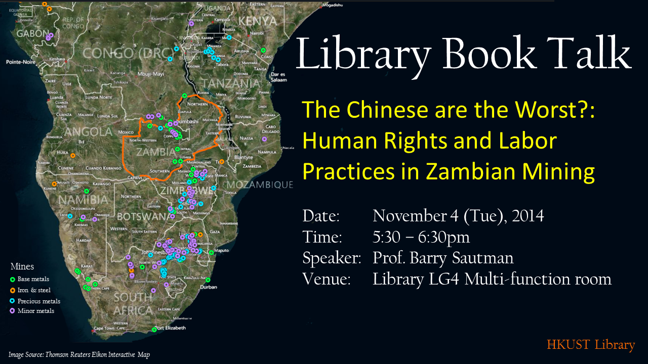 Professor Sautman will discuss his book, which examines international discourses about China-in-Africa using as a focus the 2011 Human Rights Watch (HRW) study of labor abuses at copper mining firms in Zambia (parent owned the (SOE) China Nonferrous Metal Mining Co.). He will also cover common myths about China role in Africa and share some experiences on conducting China-Africa research on-site.