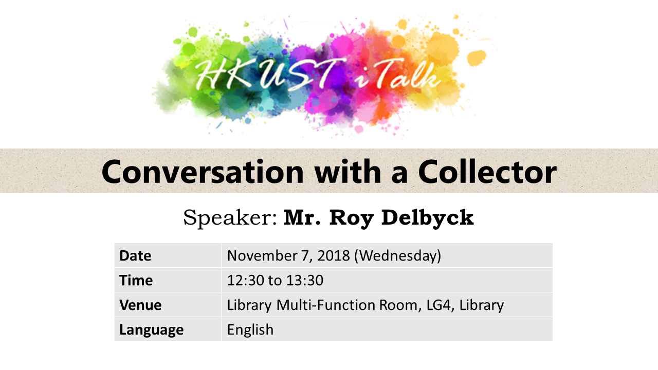 Roy has spoken on collecting and his collections at the Royal Asiatic Society, The University of Hong Kong, City University of Hong Kong and the Yale Club of Hong Kong. Photographs from his collection were exhibited at HKUST Library earlier this year.