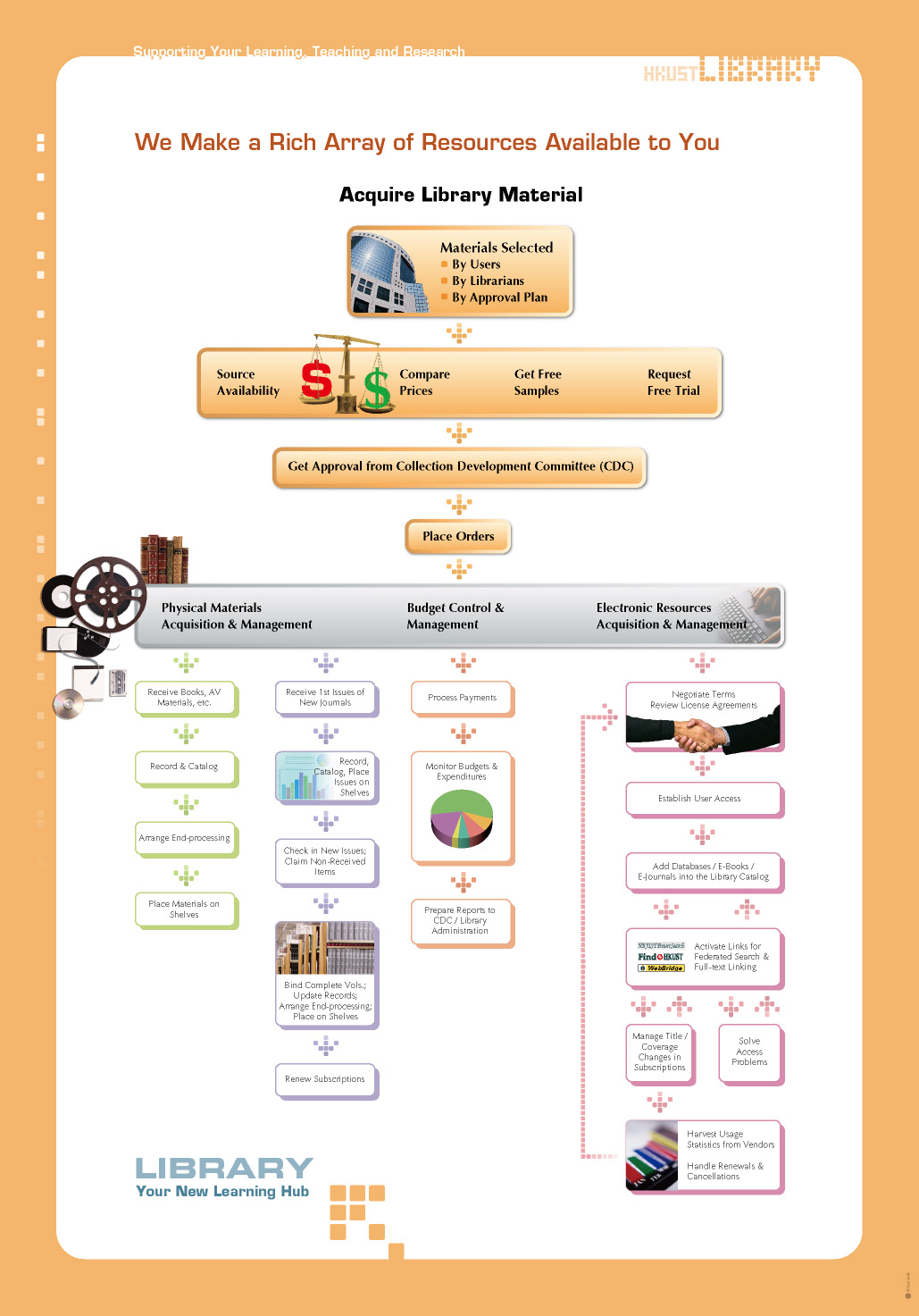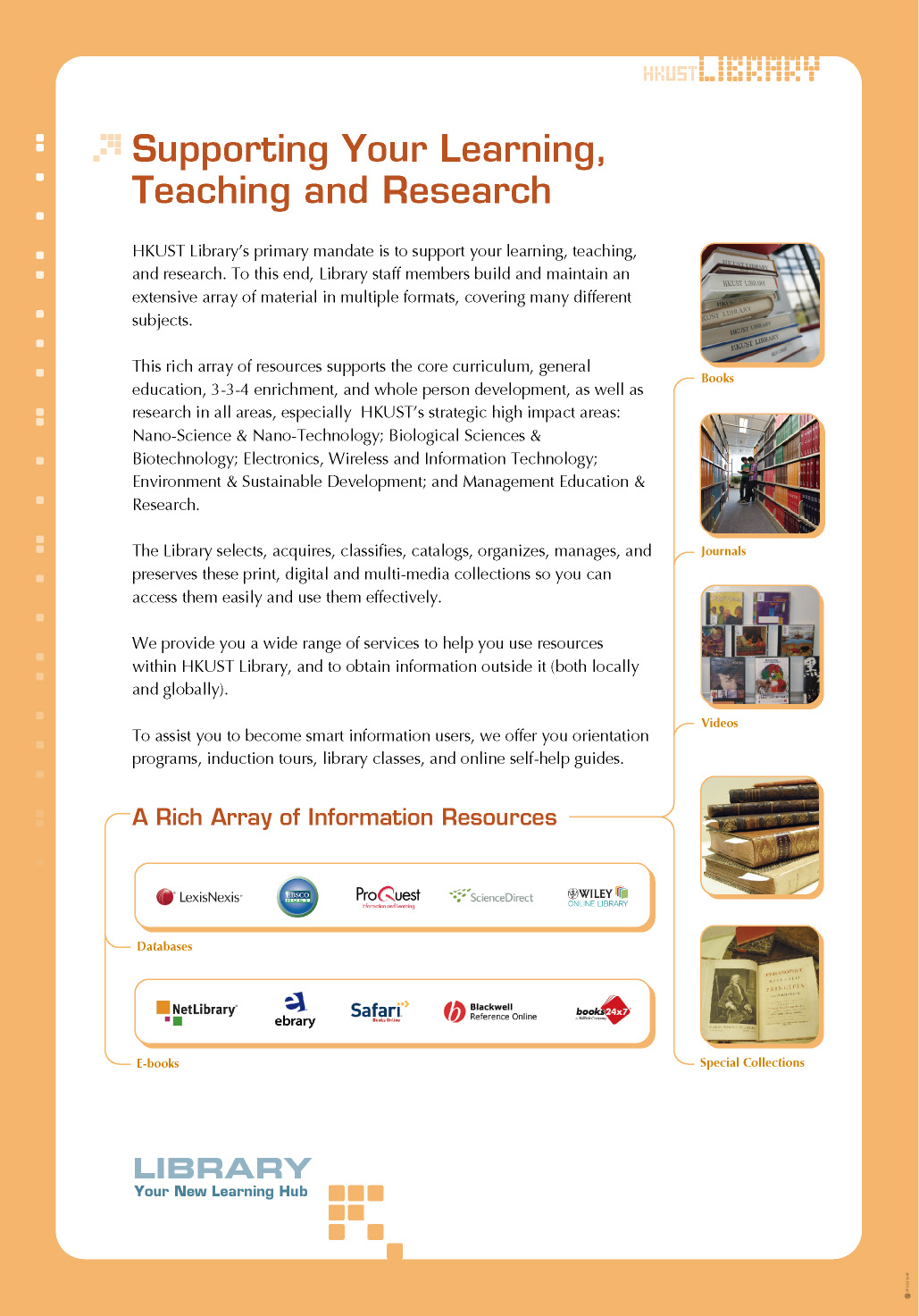 HKUST Library’s primary mandate is to support your learning, teaching, and research. To this end, Library staff members build and maintain an extensive array of material in multiple formats, covering many different subjects.