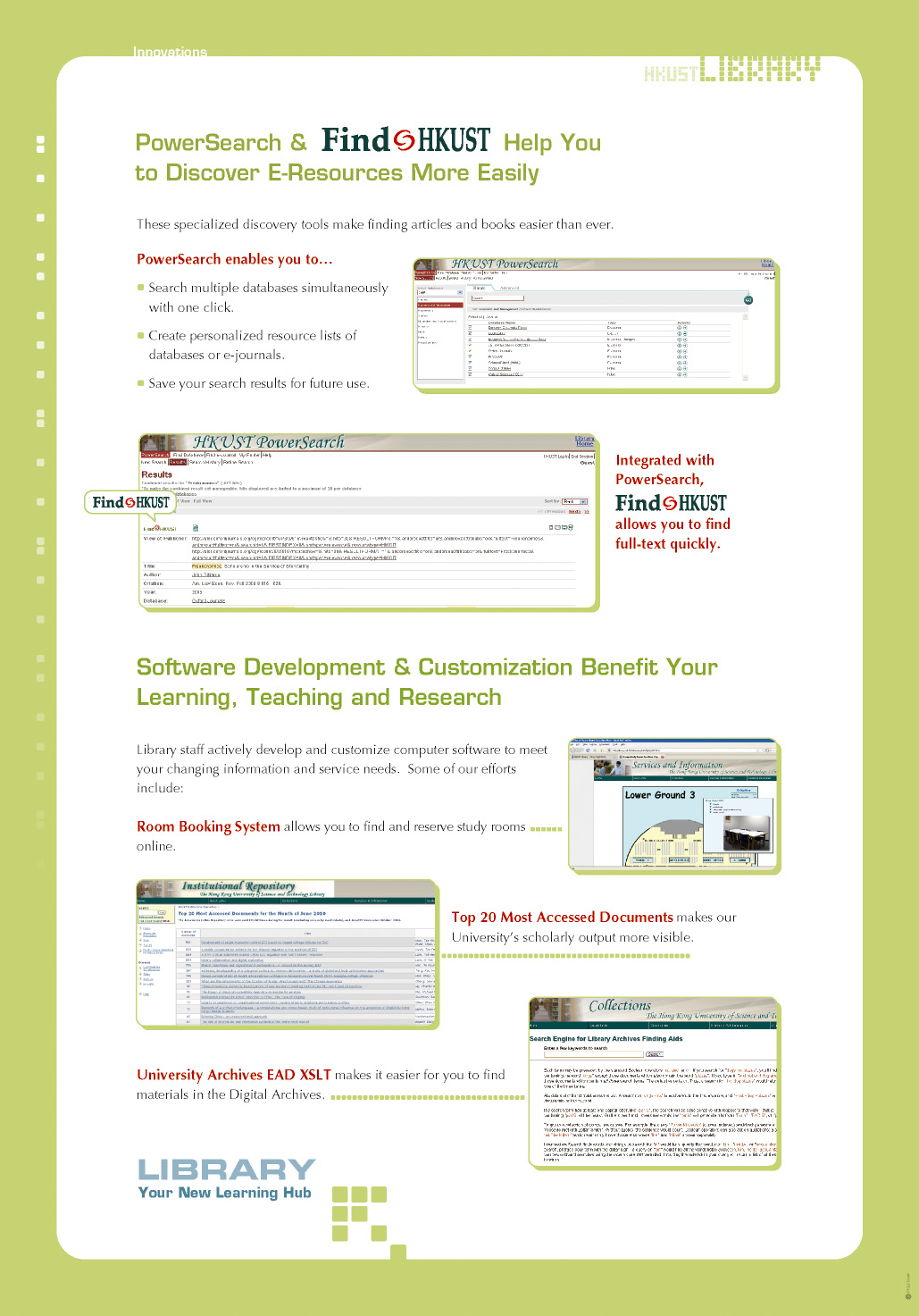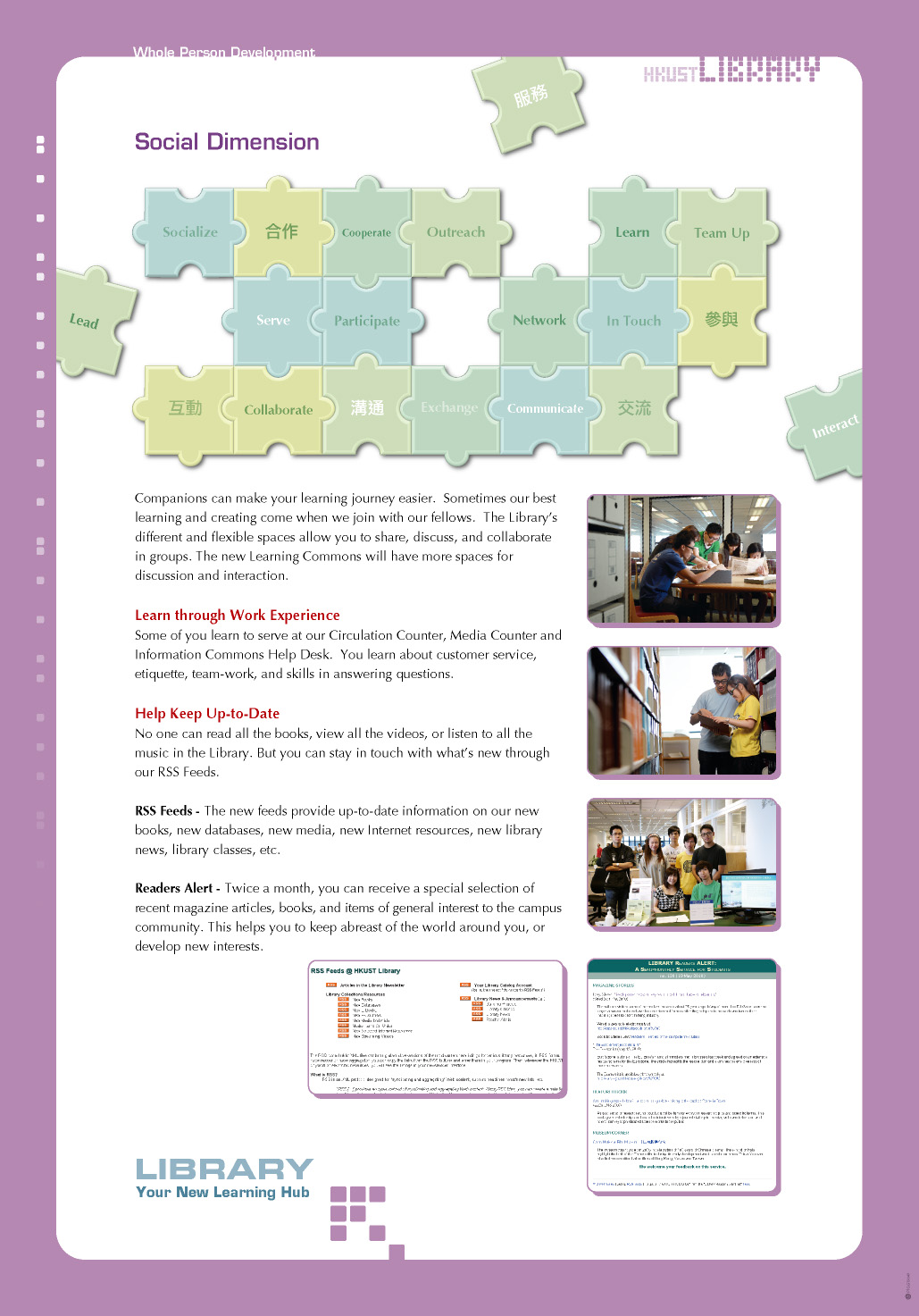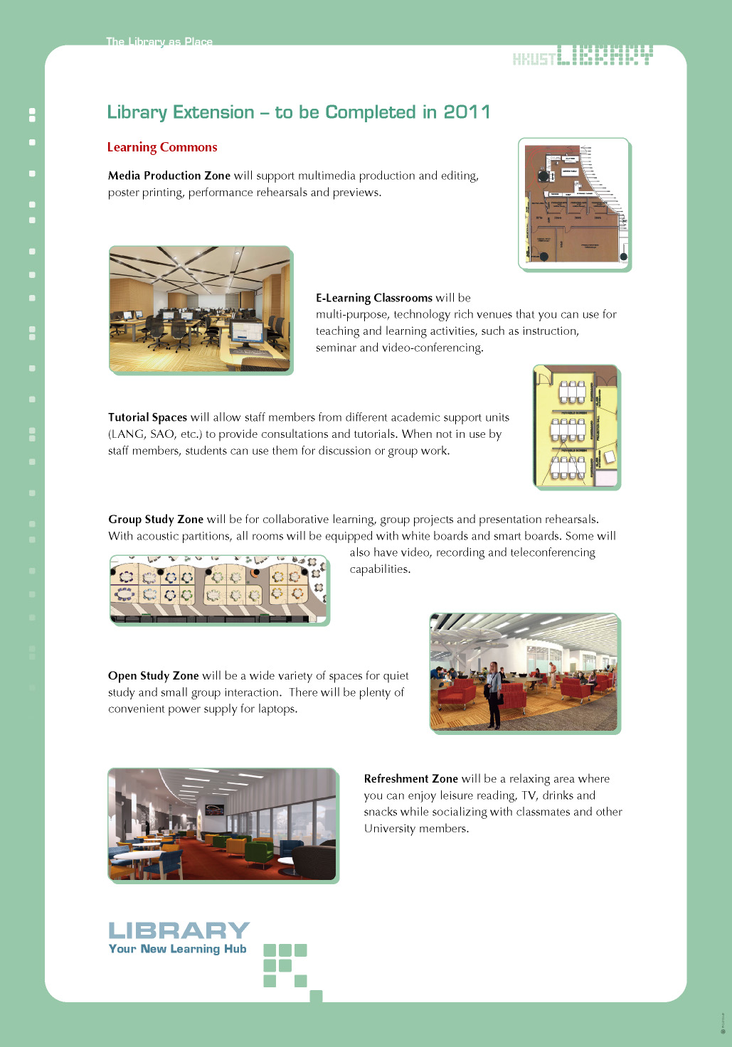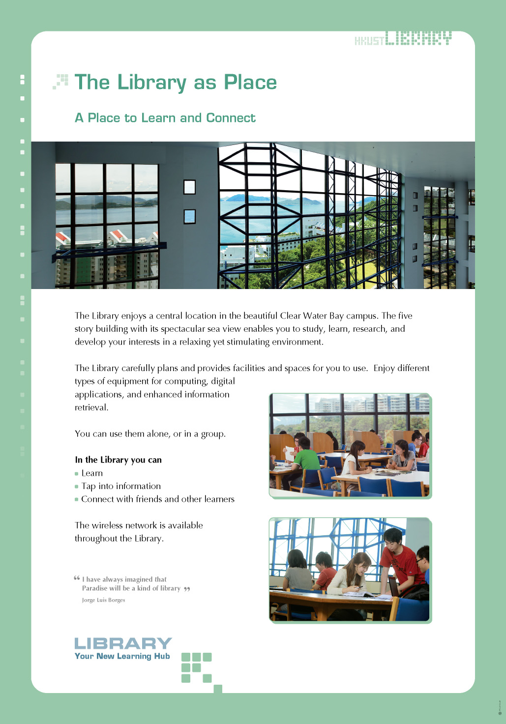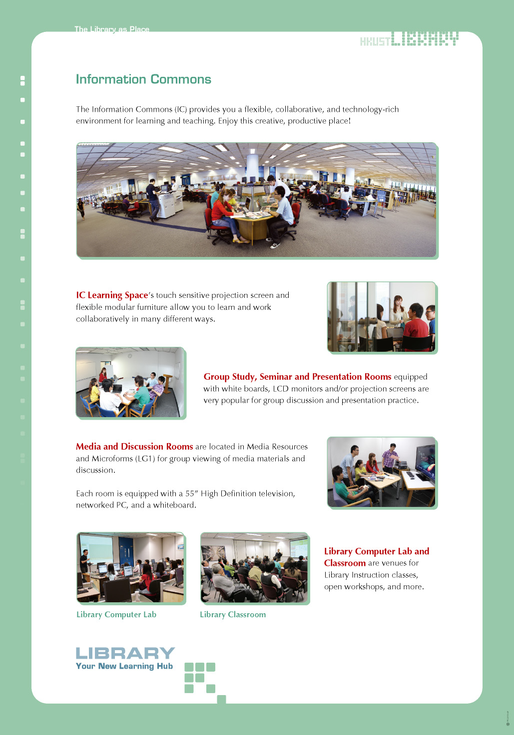 The range of services provided by the HKUST Library is now much broader than a traditional academic library. In addition to a wide variety of services, Library staff members are also involved in various activities which substantially contribute to students’ whole person development and to the enhancement of their skills set for life-long learning. When the Information Commons was established in 2006 and expanded in 2009, the Library made considerable efforts to ensure the environment provided best supports academic learning and creativity.