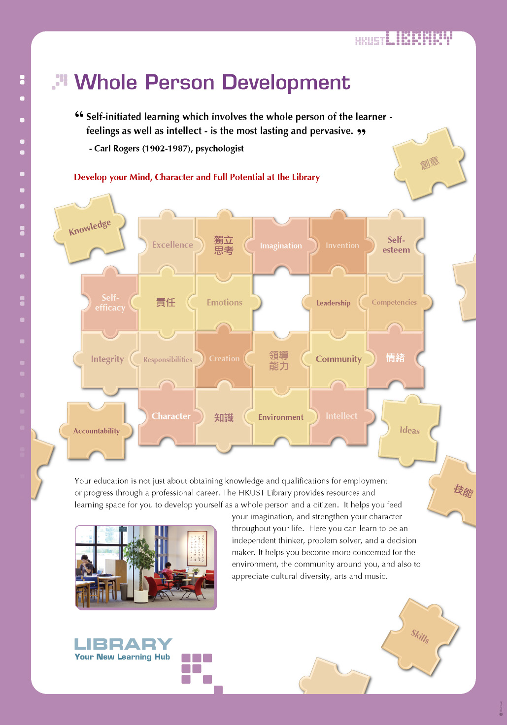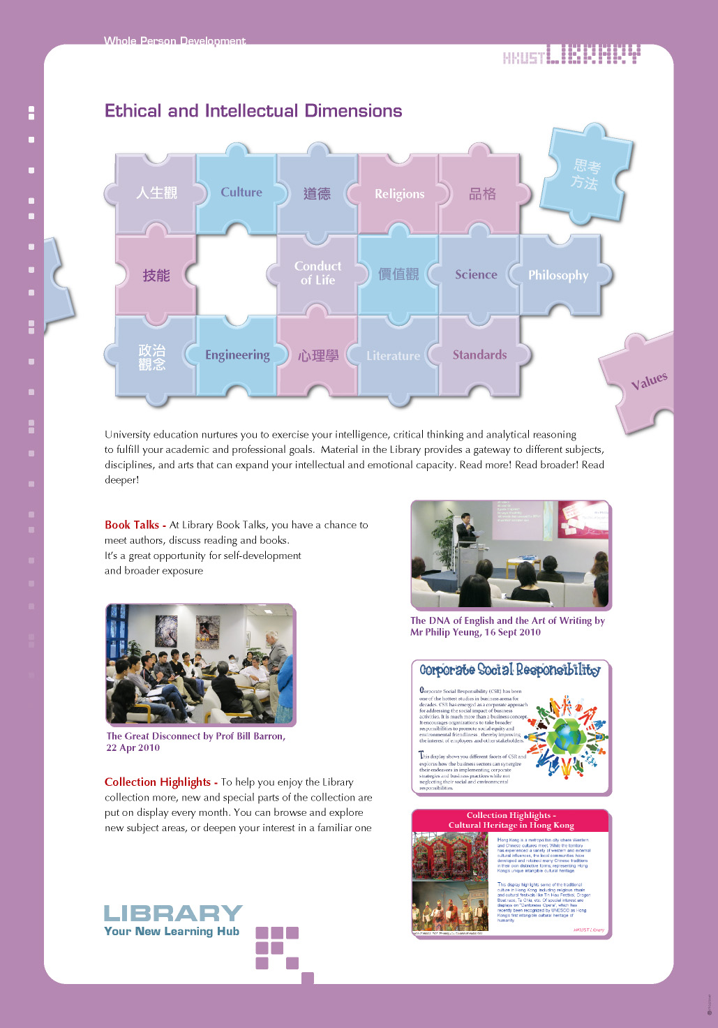 Your education is not just about obtaining knowledge and qualifications for employment. The HKUST Library provides resources and learning space for you to develop yourself as a whole person. It helps you feed your imagination, and strengthen your character throughout your life. Here you can learn to be an independent thinker, problem solver, and a decision maker. It helps you become more concerned for the environment, the community around you, and also to appreciate cultural diversity, arts and music.
