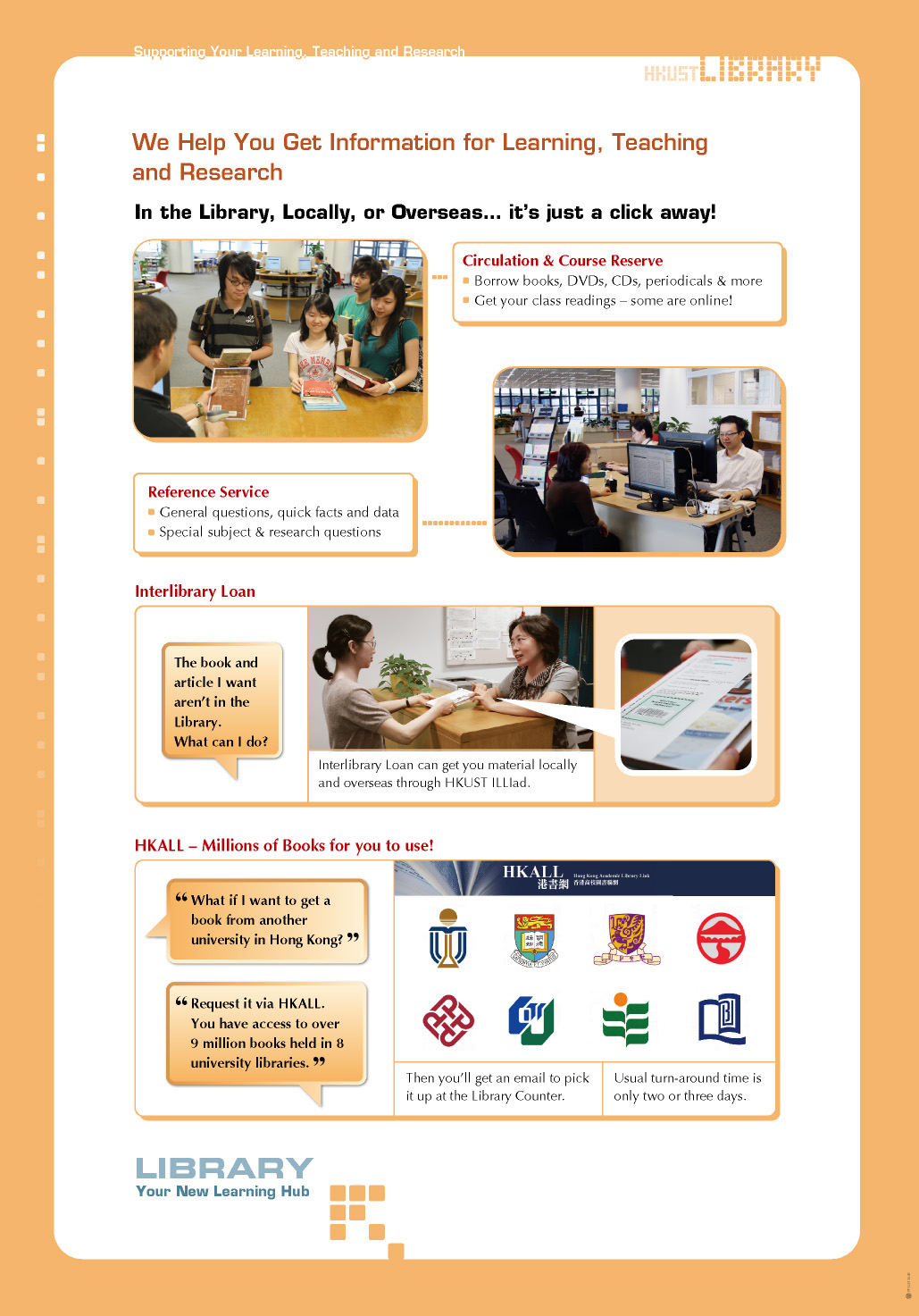 We provide you a wide range of services to help you use resources within HKUST Library, and to obtain information outside it (both locally and globally).