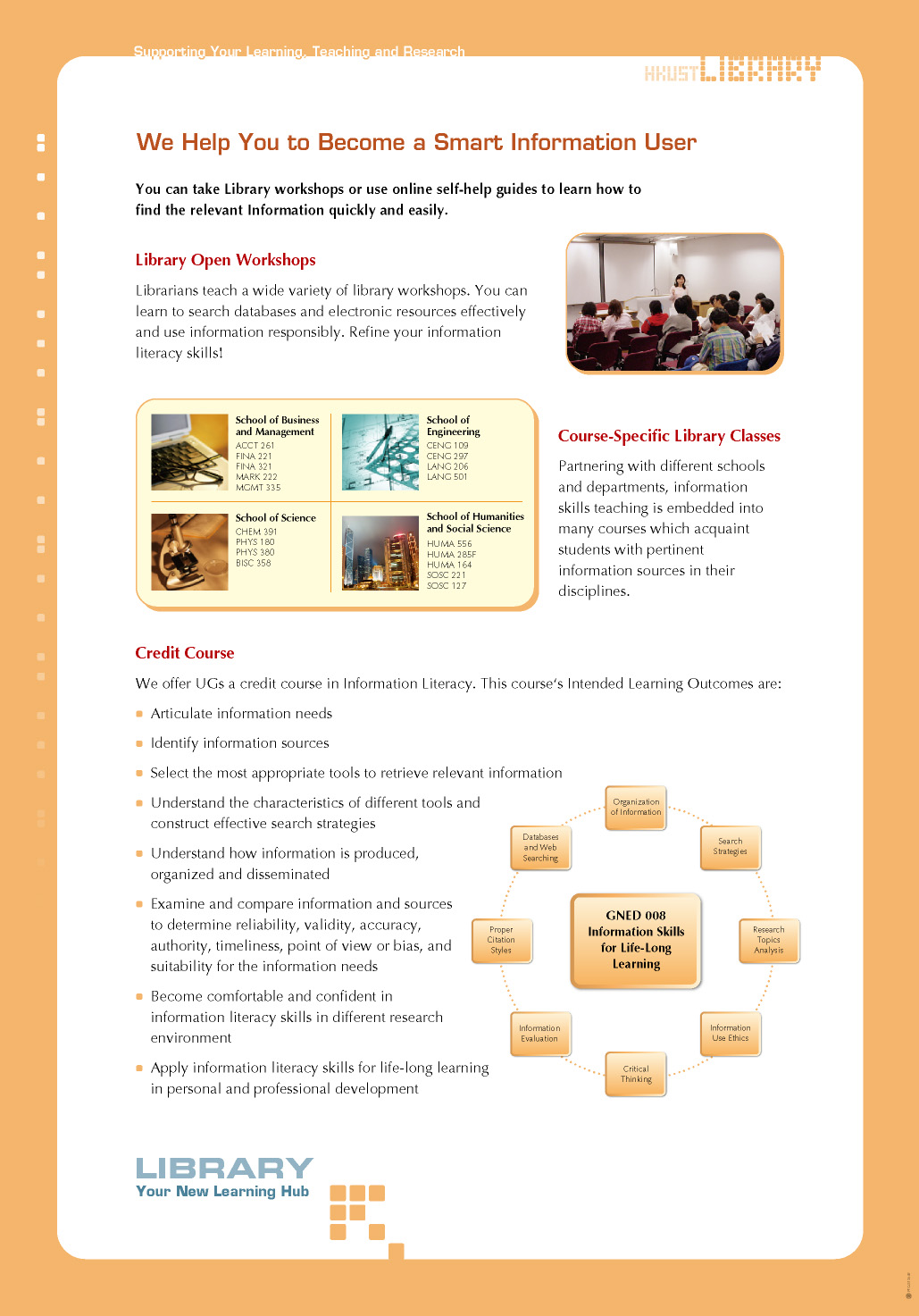 To assist you to become smart information users, we offer you orientation programs, induction tours, library classes, and online self-help guides.