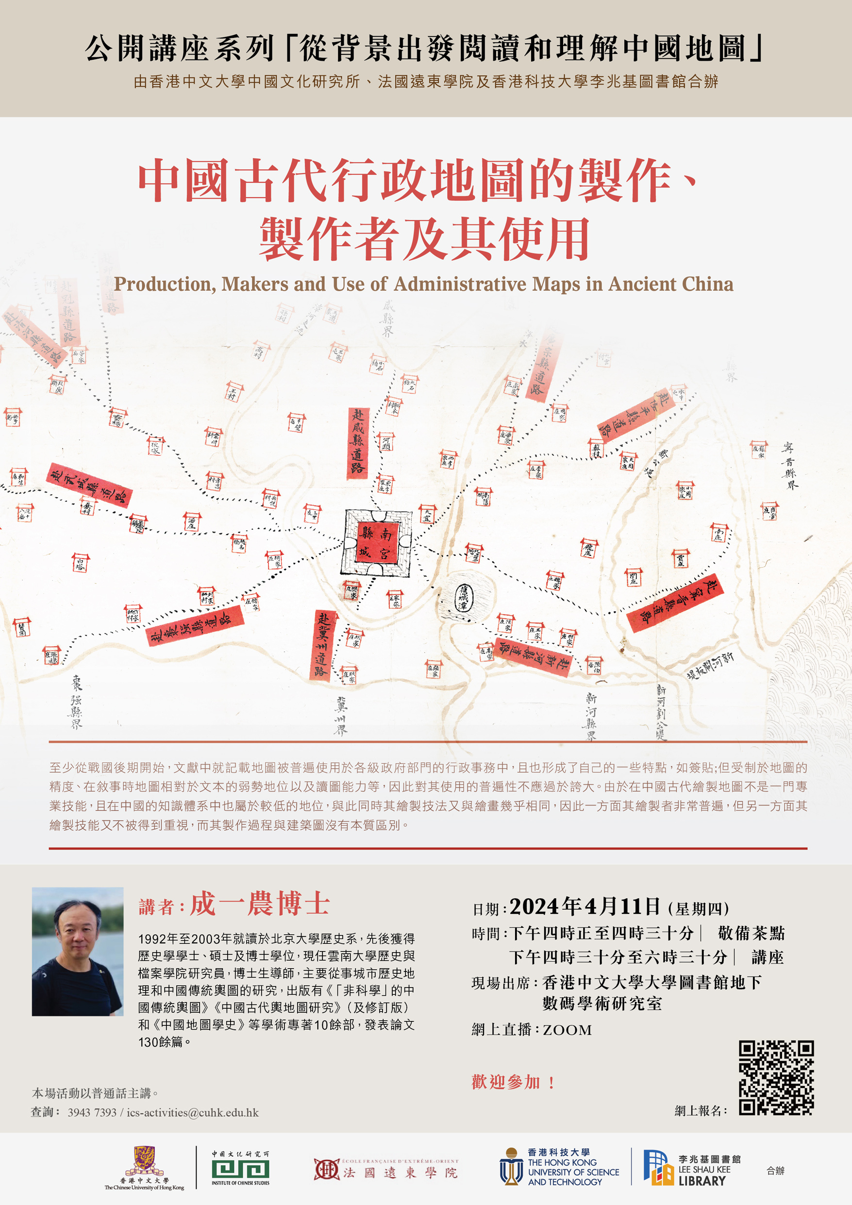 The symposium is co-organized with École française d’Extrême-Orient (EFEO), Institute of Chinese Studies, CUHK and Division of Humanities, HKUST, and is funded by Dr. Ko Pui-shuen under the Western Maps of China Project.