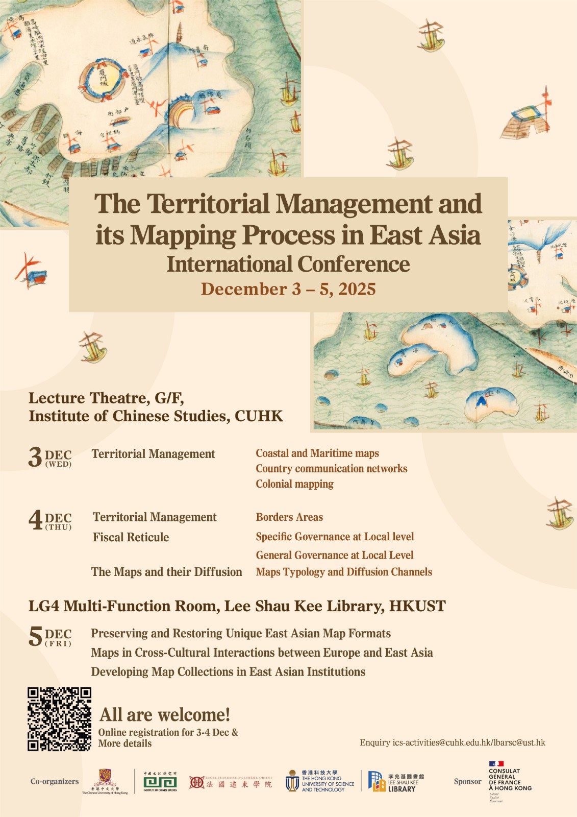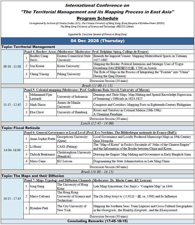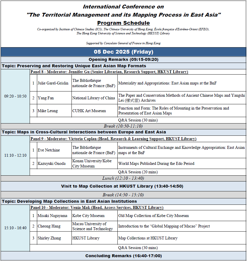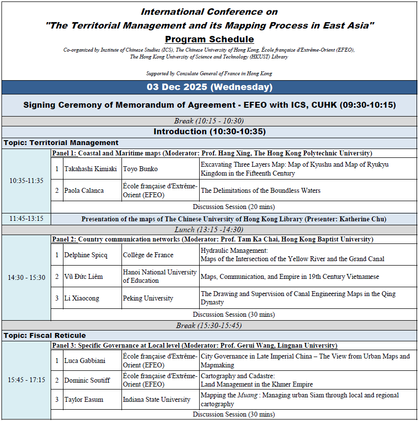 The conference is co-organized with Institute of Chinese Studies, CUHK and École française d’Extrême-Orient (EFEO) and is supported by Consulate General of France in Hong Kong. The program at HKUST is funded by Dr. Ko Pui-shuen and the Kingrich Charitable Foundation Association Limited.