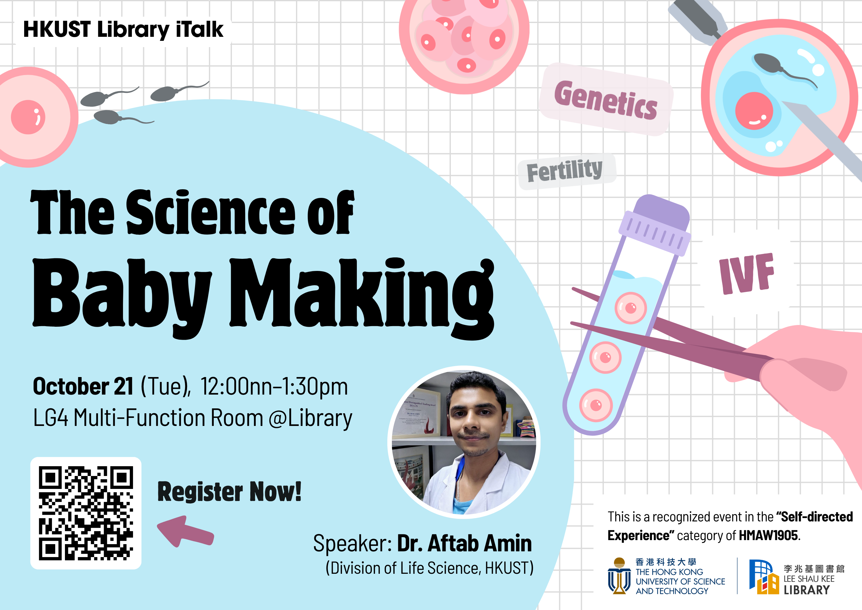 In this engaging talk,  Dr. Aftab Amin from HKUST’s Division of Life Sciences will explore genetics, inheritance, fertility issues, IVF, and more. He will help make this topic accessible whether you’re planning a family or simply curious. The talk will also include a 10 minute VR demo of the human reproductive system.