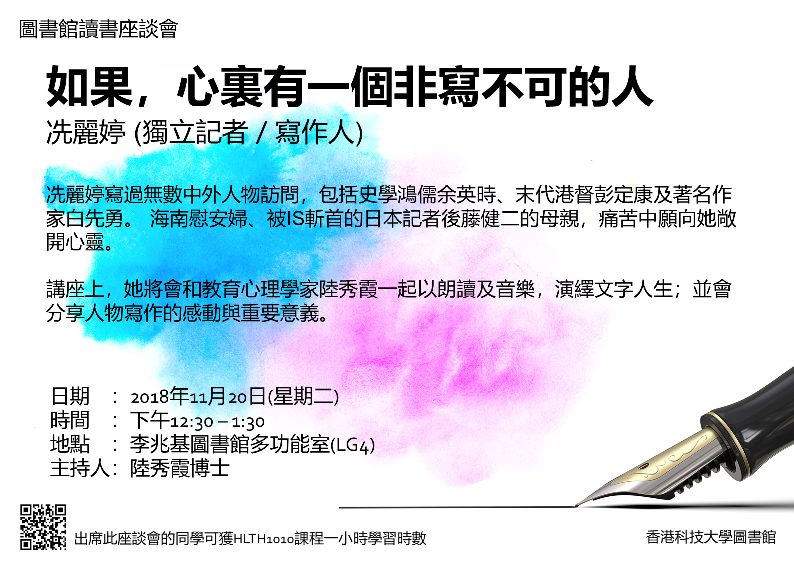 出席此座談會的科大同學可獲HLTH1010課程中"Activities"單元的"Wellness and Personal Enrichment"1小時學習時數。同學須於入場及離場時出示學生證以作記錄。