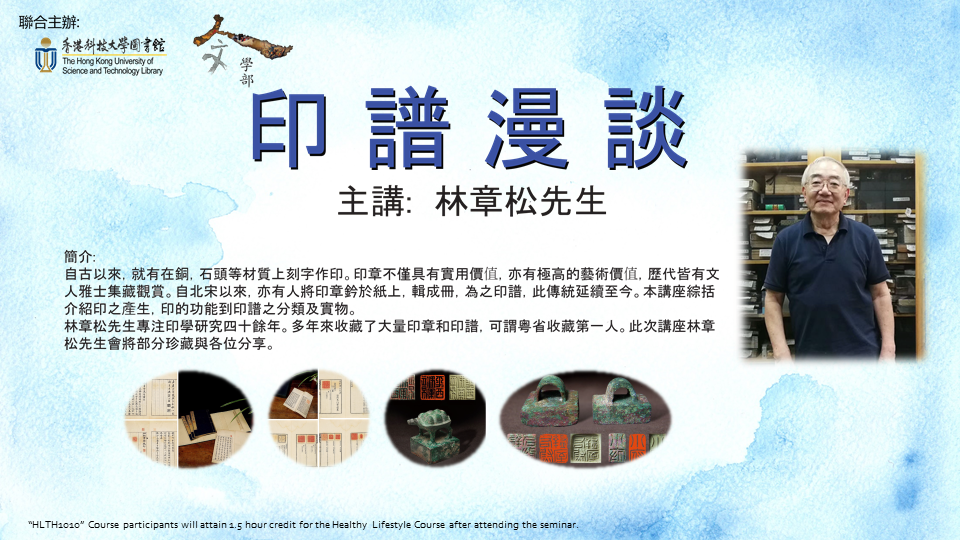 自古以來,國人就在銅、石頭等材質上刻字作印。印章不僅具有實用價值,亦有極高的藝術價值,歷代皆有文人雅士集藏觀賞。自北宋以來,亦有人將印章鈐於紙上,輯成冊,謂之印譜,此傳統延續至今。本講座綜括介紹印之產生,印的功能,印譜之分類及實物。林章松先生專注印學研究四十餘年,多年來收藏了大量印章和印譜,可謂粤省收藏第一人。此次講座林章松先生會將部分珍藏與學生分享。