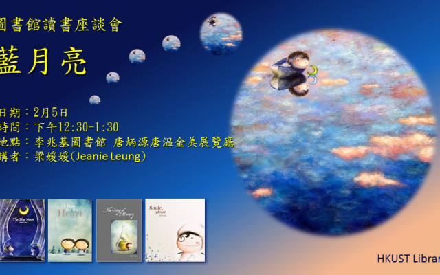 About the Talk如果現正在圖書館舉辦的畫展「故事的色彩」已俘虜您的心,那您更不能錯過梁媛媛的讀書會。梁媛媛將介紹她的新作《藍月亮》,以及她早前的三部創作:《心願》、《失落的微笑》、《回憶頌》, 更會揭開Oowa的故事背後的意義。 脫離銀行業,轉為全職藝術家,實現兒時的單純夢想;受幾米所啟發,選擇以繪本作為創作媒介,當中面對和克服種種困難;以及赴波士頓學院當交流生,期間接觸印象派大師莫內,啟發她日後的繪畫風格;梁媛媛將會與大家分享她獨特又富於色彩的 創作旅程。 繪本於讀書會即場發售,歡迎向作者索取親筆簽名。 出席此讀書會的同學可獲HLTH1010課程中"Activities"單元的"Wellness and Personal Enrichment" 一小時學習時數。同學須於入場及離場時出示學生證以作記錄。名額有限,請報名留座。About the Author梁媛媛﹙Jeanie﹚熱愛藝術和繪畫,希望以筆下的色彩觸動別人的心靈。於香港土生土長,在香港科技大學工商管理系畢業後,隨即投身銀行業。工作數年後,才發現自己最愛藝術創作,更於二零零九年毅然辭掉穩定工作, 全心全意投入繪畫創作 。雖然她從未正式修讀藝術課程,但仍決意堅持追尋夢想,立志成為全職畫家。二零一零年,她設計的角色「Oowa」正式面世,並相繼推出繪本作品及舉行展覽。梁媛媛的作品多以探索內心世界為主,以色彩傳達愛,並以筆觸帶領觀眾一同走向她的內心深處如有查詢,請聯絡 何小姐 (2358-6707)。