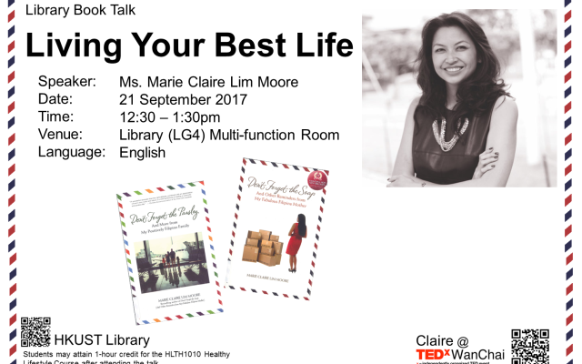 Living Your Best LifeMost of us want to live the best life we can: prosperous, healthy, loving, and giving back to our communities. Many hope to learn and grow into this in our university years and after. But we sometimes forget that the life-lessons from our families and communities can help us learn to live our best lives too.In this talk, Marie-Claire Lim Moore will talk about this, some of which she covered in her two humorous books: Don’t Forget the Soap: and more from my Fabulous Filipina Mother (Call no. E184.F4 M662 2013) and Don’t Forget the Parsley: more from my Positively Filipino Family (Call no. E184.F4 M66 2016). She will address:How we can learn from our parents advice & examples, yet make our own choicesHow to balance being involved in a "passion" (art, community work, etc.) while giving good attention to our "day job" & family responsibilities.Finding, keeping & balancing your "self" across multiple identities, communities, and responsibilitiesStudents may attain 1 hour in "Wellness and Personal Enrichment" of the "Activities" module in the HLTH1010 Course after attending the talk. Please show your student cards on arrival and leaving. Limited space, please register at Library Event Registration. For non-HKUST registrants, please email us at library@ust.hk.About the Author:Marie Claire Lim Moore is a Filipina-Canadian-American working mother, author, and speaker. After spending her early childhood in Vancouver, her family moved to New York City, where she attended the United Nations International School. She went on to study at Yale (B.A.) and then went into banking; climbing the corporate ladder at Citi, and traveling around the world. She also holds an EMBA from Fordham University.She met her husband while working in Sao Paulo, Brazil and they married in Manila shortly before they moved to Singapore, where she managed the Global Client business for Citi in Asia. Marie Claire and her husband and three children now live in Hong Kong, where she works as Head of Visa Consulting for Hong Kong and Taiwan. Previously, she served as the Development Director at The Womens Foundation, a Hong Kong charity dedicated to improving the lives of women and girls.
