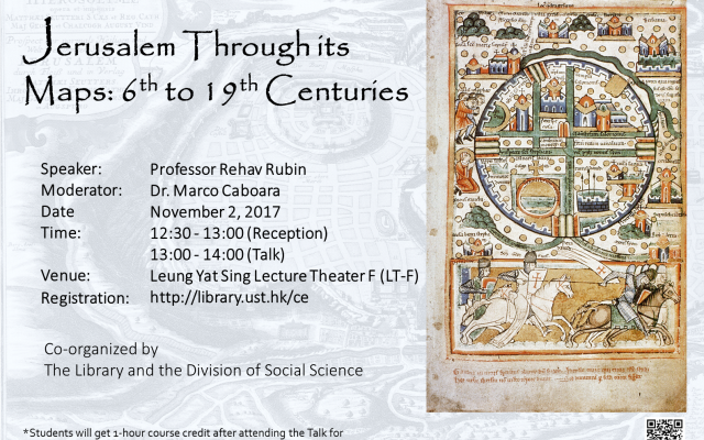 Jerusalem, a city revered by Jews, Christians, and Muslims, has been depicted on legions of maps, probably earlier and more frequently than any other city. This talk will survey the maps of Jerusalem through time, from the 6th century Madaba Mosaic map, to the early accurate maps from the late 19th century. Some of the maps depicted a realistic view of Jerusalem but many others are imaginary images of Jerusalem of the Holy Scriptures. Therefore the maps serve as a mirror through which we can look at the development of Jerusalem on one hand and at the perceptions of the Holy City held by European scholars and map-makers on the other hand.The event is co-organized by the Library and Division of Social Science. Prof. Kellee Tsai, Division Head and Chair Professor of Social Science, will introduce Prof. Rubin before the talk.A reception will be held before the talk at 12:30.Attendees can expect to acquire knowledge of the following:About historical-cultural aspects of Jerusalem and the Holy Land.Develop and deepen interests for geography and history.Develop artistic skills in appreciating historical maps and some basic skills and dimensions in appreciating maps. Admire the valuable special maps collection. RegistrationRegister at Library Event Registration.HKUST students may attain 1 hour credit for the HLTH1010 Healthy Lifestyle Course after attending the talk. Please show SID card on arrival for registration. Professor Rehav RubinProf. Rubin is a professor at the Department of Geography at the Hebrew University of Jerusalem; he is currently the Elman Family Visiting Professor of Jewish and Israeli Studies in the Division of Social Science at HKUST. His main areas of research and teaching is the history of cartography and mapping of Jerusalem and the Holy Land; geographical aspects of pilgrimage and Holy Places; historical geography of Israel/Palestine, especially in late antiquity.