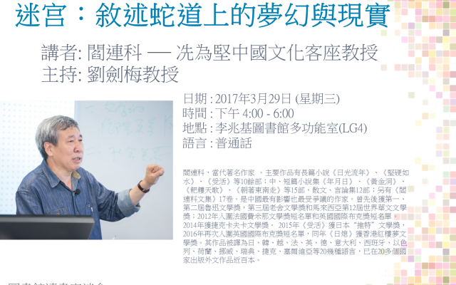座談會簡介如同文學上的“荒誕”是為了卡夫卡而存在,“迷宮”在文學上是為博爾赫斯而生成。那麼,他的小說真的是迷亂無跡的迷宮,還是有跡可尋的文學新徑?走進去,每個人都可以發現一種新美和屬於自己的新世界。這次座談會由香港科技大學人文社會科學學院人文學部,香港科技大學賽馬會高等研究院及香港科技大學圖書館聯合舉辦。名額有限,請報名留座。 講者簡介閻連科,1958年出生於中國河南省嵩縣,1978年應徵入伍,1985年畢業於河南大學政教系、1991年畢業於解放軍藝術學院文學系。 1979年開始寫作,主要作品有長篇小說《日光流年》、《堅硬如水》、《受活》、《為人民服務》、《丁莊夢》、《風雅頌》、《四書》、《炸裂志》 、《日熄》等10餘部;中、短篇小說集《年月日》、《黃金洞》、《耙耬天歌》、《朝著東南走》等15部,散文、言論集12部;另有《閻連科文集》17卷。是中國最有影響也最受爭議的作家。曾先後獲第一、第二屆魯迅文學獎,第三屆老舍文學獎和馬來西亞第12屆世界華文文學獎;2012年入圍法國費米那文學獎短名單和英國國際布克獎短名單。 2014年獲捷克卡夫卡文學獎。 2015年《受活》獲日本“推特”文學獎,2016年再次入圍英國國際布克獎短名單,同年《日熄》獲香港紅樓夢文學獎。其作品被譯為日、韓、越、法、英、德、意大利、西班牙、以色列、荷蘭、挪威、瑞典、捷克、塞爾維亞等20幾種語言,已在20多個國家出版外文作品近百本。 2004年退出軍界,現供職於中國人民大學文學院,為教授、作家和香港科技大學冼為堅中國文化客座講授。 About the TalkIn this talk, Prof. Yan will share his passion for literature and give us a glimpse into the alluring world of his journeys in writing.This talk is co-organized by the Division of Humanities, School of Humanities & Social Science, the HKUST Jockey Club Institute for Advanced Study, and the HKUST Lee Shau Kee Library. About the SpeakerYan Lianke was born in a small village of Song County, Henan province in 1958. In 1978 he joined the People’s Liberation Army (PLA), in 1985 he graduated from Henan University majoring in Political Education, and in 1991 he received a degree from the Literature Department of the PLA Academy of Art. He began his writing career in 1979, and his novels include The Passing of Time, As Hard as Water, Lenin’s Kisses, Serve the People!, Dream of Ding Village, Odes and Hymns, The Four Books, and The Day the Sun Died. As one of contemporary China’s most controversial and influential authors, he has received more than twenty distinguished national and international literature prizes, including the First and Second Lu Xun Literature Prize, the Third Lao She Literature Prize, and the Hua Zhong World Chinese Literature Award. He was a finalist for the Prince of Asturias Literature Prize and the Prix Femina Literature Prize, and was shortlisted for the Man Booker International Prize in both 2013 and 2016. In 2014 he was awarded with the Franz Kafka Literature Prize, and in 2016 his novel The Day the Sun Died won the Dream of the Red Chamber Literary Prize from Hong Kong. His works have been translated into more than twenty languages, including Japanese, Korean, Vietnamese, French, English, German, Italian, Dutch, Hebrew, Spanish, and Serbian. Many of these translations have attracted attention and critical acclaim for the novels in their respective literary markets. There has been considerable dispute over his writing in China, but he has stood as a writer with deep conscience and great passion. In 2004, he quit the Chinese People’s Liberation Army. He is currently a professor at Renmin University in Beijing, and Sin Wai Kin Visiting Professor of Chinese Culture at Hong Kong University of Science and Technology.