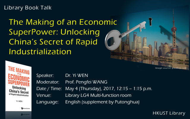 About the TalkDr. Wen will discuss his book, “The making of an economic superpower: unlocking China’s secret of rapid industrialization" (call number: HD3616.C63 W46 2016). This book argues that the generally accepted institutional theory of economic development is highly inadequate in explaining China’s astonishing economic growth, and only a radical reinterpretation of the history of the Industrial Revolution and the rise of the West can fully explain China’s growth miracle in the past 30 years. 座談會簡介文一教授認為當代主流經濟學理論,尤其是關於經濟發展的製度經濟學理論,無法解釋中國過去三十年的崛起。在這次座談會中,文一將討論其著作《偉大的中國工業革命: "發展政治經濟學"一般原理批判綱要》(索書號: HD3616.C63 W462 2016)及重新闡釋工業革命和西方崛起的歷史來解釋中國增長的奇蹟,以及為什麼中國的崛起是不可阻擋的。About the SpeakerDr. Wen Yi (PhD., University of Iowa, 1996) is currently a Senior Economist and Assistant Vice President at the Federal Reserve Bank of St. Louis and Distinguished Visiting Professor at the Tsinghua University School of Economics and Management, and PBC School of Finance in China. He previously held academic positions at the Hong Kong University of Science and Technology, Cornell University, Washington University in St. Louis, and served as inaugural CCB Chair Professor in the School of Economics and Management at Tsinghua University. His research interest is related to macroeconomics, monetary policy, economic growth and development. In addition, his editorial activities include: (i) Co-editor, China Economic Review (2011 – present); (ii) Associate Editor, Macroeconomic Dynamics (2009 – 2012), (iii) Associate editor, Journal of Economic Dynamic and Control (2010 – present), etc. 講者簡介作者為清華大學經濟管理學院CCB講席教授(2008-2015),經管學院和五道口金融學院資深訪問教授,中國國家“千人計劃”入選者。 1982年獲華西醫科大學醫學學士,1991年獲美國聖母大學哲學碩士,1996年獲美國愛荷華大學經濟學博士。之後曾任職於香港科技大學經濟系(1996-1999),美國康奈爾大學經濟系(1999-2005),美國聯邦儲備銀行(聖路易斯分行)研究部,2008年升任助理副行長並獲得美國印第安納大學(Bloomington)經濟系終身正教授聘書。研究方向為宏觀經濟學,研究領域包括商業周期和經濟波動理論,動態優化中的多重均衡和市場失靈,理性預期下自我實現的資產泡沫,貨幣政策和量化寬鬆政策的微觀基礎與動態一般均衡,發展政治經濟學和中國宏觀經濟,等等。兼任過《宏觀經濟動力學》副編輯(Macroeconomic Dynamics, Associate Editor,2009-2012)、《經濟動力學與控制論》副編輯(Journal of Economic Dynamics and Control, Associate Editor,2010年-至今),《中國經濟評論》副主編(China Economic Review, Co-Editor,2011年-至今),和清華大學《經濟學報》(中文)副主編(Co-Editor, 2014年-至今)。