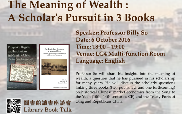 About the Talk: Professor Billy So will share his insights into the meaning of wealth, a question that he has pursued in his scholarship for many years. It is also the linking thread that he explores in three books (two published, and one forthcoming) on historical Chinese market economics. Among the questions he will address are, why study this, and write about it? What insights has he drawn from examining Chinese economic history from the Song to the Yuan (10th - 14th centuries CE) and the Treaty Ports of Qing and Republican China?About the Speaker Since 2011, Billy So has been a Chair Professor and the Head of the Division of the Humanities here at HKUST. He received his BA and MPhil from CUHK, and his PhD at Australian National University. His research interests are diverse (including Chinese legal history, Chinese business history, institutional economic history of late imperial and Republican China, and more) yet all relate to his fundamental academic concerns: prosperity, justice, space, and identity.