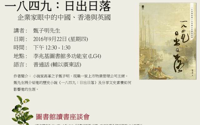 座談會簡介小說 《一八四九:日出日落》,是講者甄子明的新作,他以非常視角講述了一段中、港、英的重要歷史。讀史知人:工程、商業、經濟、政策研究不只是對著數字、公式,更重要是要對人。如何認識人?在心理學能找到答案嗎?講者認為要從文化入手,歷史、文學是最 佳途徑。他將以二十年的中國業務之經驗,分享文史素養如何影響他的生涯。鑒史識时:香港真正的歷史是怎麼樣的?英國與香港對中國有什麼影響?了解這些對於在中國工作有何裨益?講者與你共享他對這些問題的獨到見解。講者簡介甄子明在香港出生,在香港和英國受教育。他是香港大學工學士、工管碩士、英國倫敦經濟學院經濟學碩士,是專業工程師,從事香港和國內的房地產業務,現職一家上市物業管理公司主席。甄子明父親是六十年代的武俠小說作家高峰,所以他幼承庭訓,自小就對中國文學、文化和歷史有濃厚興趣。由於身在香港和英國,他亦有機會培養世界視野。除了從書本上認識中國和世界歷史以外,他在中國大陸工作了十多年,所以對中國、英國、和作為中英文化橋樑的香港,都有比較深刻的認識。他接觸過各個地方的不同階層,並在九十年代成為中國一家國企的房地產總經理,是第一個香港人擔任此職務,亦因此成為第一代香港回國內參與房地產建設的人。《一八四九:日出日落》 是他的第一本歷史小說,花了四年時間收集資料、研究和寫作。出席此座談會的同學可獲HLTH1010課程中"Activities"單元的"Wellness and Personal Enrichment" 1.0小時學習時數。同學須於入場及離場時出示學生證以作記錄。名額有限,請報名留座。