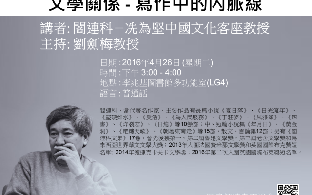 座談會簡介小說的內部都有一種關係存在。小說是人學,其實更是人物的文學關係學。這種文學關係主要表現為人物與人物的文學倫理關係、人物的文學社會關係、文學的社會倫理關係、人物與物及自然的非人與人的關係、人物的心理關係等。弄清了這種關係,就大體揭開了文學最隱秘的面紗,大體把握了一部作品的根本講者簡介閻連科 (現為香港科技大學冼為堅中國文化客座教授),1958年出生出生於中國河南省嵩縣的一個偏窮小村,1978年應徵入伍,1985年畢業於河南大學政教系、1991年畢業於解放軍藝術學院文學系。 1979年開始寫作,主要作品有長篇小說《夏日落》、《日光流年》、《堅硬如水》、《受活》、《為人民服務》、《丁莊夢》、《風雅頌》、《四書》 、《炸裂志》等10餘部;中、短篇小說集《年月日》、《黃金洞》、《耙耬天歌》、《朝著東南走》等15部,散文、言論集12部;另有《閻連科文集》17卷。其中《夏日落》、《為人民服務》、《丁莊夢》和《四書》四部小說在中國遭禁,是中國最受爭議的作家。曾先後獲第一、第二屆魯迅文學獎,第三屆老舍文學獎和馬來西亞世界華文文學大獎;2013年入圍法國費米那文學獎和英國國際布克獎短名單; 2014年獲捷克卡夫卡文學獎,2016年第二次入圍英國國際布克獎短名單。其作品被譯為日、韓、越、法、英、德、意大利、西班牙、以色列、荷蘭、挪威、瑞典、捷克、塞爾維亞等20幾種語言,在20多個國家和地區出版。 2004年因“作品令人擔憂”而退出軍界,現供職於中國人民大學文學院,為教授、作家。出席此座談會的同學可獲HLTH1010課程中"Activities"單元的"Wellness and Personal Enrichment" 1.0小時學習時數。同學須於入場及離場時出示學生證以作記錄。名額有限,請報名留座。About the TalkIn this talk, Prof. Yan will share his passion about literature and he will also give us a glimpse into the alluring world of his writing journey.About the SpeakerYan Lianke (Sin Wai Kin Visiting Professor of Chinese Culture), was born in a small village in Song county, Henan province in 1958. In 1978 he joined the Chinese People’s Liberation Army (PLA), and in 1985 he graduated from Henan University with a major in Political Education. In 1991, he received a degree from the Literature Department of the PLA Academy of Art. He began writing fiction in 1979, and to-date he has published eleven novels, ten novellas, five volumes of prose, and a seventeen-volume “collected works.” His novels include Summer Sunset, Years after Years, As Hard as Water, Lenin’s Kisses, Serve the People!, Dream of Ding Village, and The Four Books. He has received more than twenty national and international literary prizes, including the first and second Lu Xun Literature Prize, and third Lao She Literature Prize, and the Malaysia World Chinese Literature Award. He was a finalist for the Prince of Asturias Literature Prize and the Prix Femina Literature Prize, and was shortlisted for the 2013 Man Booker International Prize. In 2014 he was the first Chinese writer to be awarded the Franz Kafka Literature Prize. In 2016, he was shortlisted for Man Booker International Prize. His works has been translated into more than twenty languages, including Japanese, Korean, Vietnamese, French, English, German, Italian, Dutch, Hebrew, Spanish, and Serbian. There has been considerable dispute over his writing in China, and he has stood as a writer with deep conscience and great passion. In 2004, he quit the Chinese People’s Liberation Army. Now, he is a professor at Renmin University in Beijing. But Summer Sunset, Serve the People!, Dream of Ding Village and the Four Books have been either banned or were not able to be published in China. Yan Lianke is a writer of the most independent and controversial in Chinese contemporary authors.