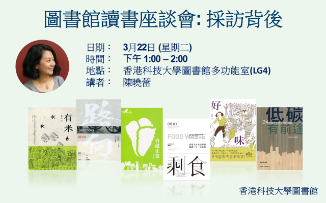 座談會簡介陳曉蕾女士2009年離開報館, 開始全職採訪,並在不同媒體以不同方式發表專題報導。她近年探討的議題包括香港農業、低碳、剩食、環保、教育改革、衰老死亡和善終,同時也擅長以人物專訪和描寫,帶出相關的議題。陳女士在讀書會中會和大家分享她採訪背後的動力和故事。其著作亦會在讀書會即場發售,歡迎向作者索取親筆簽名。陳曉蕾女士簡介香港記者,長期關注城市可持續發展議題,報導《死在香港 : 流眼淚》取得2014年香港書獎、《剩食》取得2012年香港書獎、台灣開卷好書2011年十大最佳中文創作;《有米》取得2013年十大好書龍虎榜最高票選。 其他作品包括《阿媽》, 《好味》, 《死在香港 : 見棺材》等。名額有限,請報名留座。如有查詢,請聯絡黄小姐 (2358-6751)。