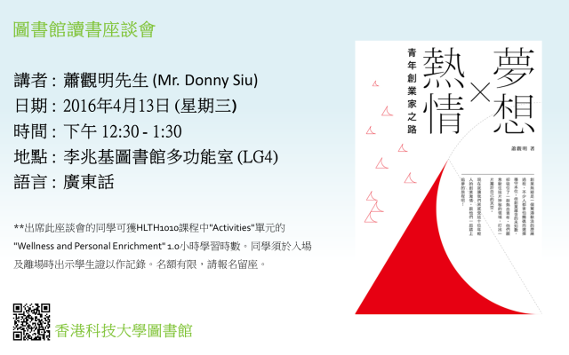 座談會簡介從小喜歡天馬行空的我,與很多人一樣經常做夢,小時候曾經夢想過將來做警察、消防員、會計師、律師、飛機師、教師,當然少不了還有政府的政務主任和行政主任。可惜大學畢業後只能進入一間私人銀行做個小職員,每天坐在中環某甲級寫字樓的高層中,對著幾部電腦屏幕和做數不清的刻板數字工作。1991年2月仍寒但陽光普照的一天,我如常在午飯時間帶上份報紙,買了盒初級白領最愛的义雞飯,坐在中環碼頭享受著熱飯與陽光帶來的溫暖之際,眼球突然間被報紙上的一行字吸引著 --- "香港科技大學學生事務處招聘二級行政主任"。又大學、又學生、又行政主任,正正擊中我當時的心理需要! 還沒趕及把口中已到喉嚨椗那塊肥美的义燒吞下,便立即連跑帶跳的衝回雲層中的辦公室,趕緊把早前已用過申請其他工作的個人履歷再作修改,立即入紙申請這份Dream Job! 最後居然在亂打亂撞的情況下加入了科大這個大家庭,跟本從未想過一做便做了25個年頭。回想過去的25年,現實中不知不覺把夢和想變成事實。我眼見這麽多同學和校友在實踐他們個人理想和創業夢時的堅持、努力和信念,實在值得與人分享。我便嘗試把其中十多位校友創業的心路歷程,原汁原味以文字記載下來,並加上自己多年的觀察,分析為何科大會静静地成為創業夢想家的搖籃的可能原因,寫成《夢想 X 熱情 -- 青年創業家的路》一書,讓大眾知道夢想是可以用努力和想像力而實現的,我們無論是什麼年紀也應該用積極的態度去面對這個充滿機遇的世界。作者將在今次的午間座談會帶大家進入他的夢想世界,與及分享書中科大校友的創業故事。出席此座談會的同學可獲HLTH1010課程中"Activities"單元的"Wellness and Personal Enrichment" 1.0小時學習時數。同學須於入場及離場時出示學生證以作記錄。名額有限,請報名留座。講者簡介小時的蕭觀明(Donny)住在公屋,在科大25年的光陰早已把三千煩惱絲全掉在科大校方不同的地方。現為學生事務處副處長 、創業中心副主任、教職員協會主席。曾做過校董會民選的職員代表,亦曾經因為公開說夢想而被同事取笑,更在幫助學生創業時被人嘲笑是門外漢。多年來與眾多學生和校友結下不解緣,為他們解難獻法,很多更成為好朋友。眼見眾多的同學和校友們非常積極的為自己的萝想而努力,特別是那些選擇走創業這條艱辛的路的一群,他便覺得值得把他們創業的心路歷程記載下來讓大家分享,於2015年7月出版《夢想 X熱情 -- 青年創業家的路》一書,此書在香港書展名列十大最暢銷榜。