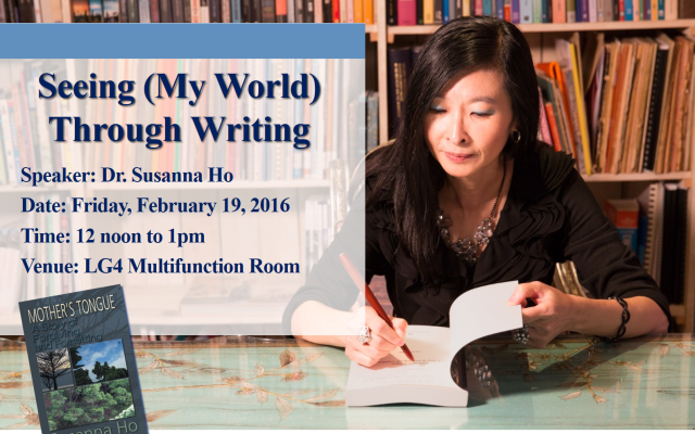 About the TalkDr. Susanna Ho of the Center for Language Education at HKUST will discuss and compare her two novels: Mother’s Tongue: A Story of Forgiving and Forgetting and her very recent, Who’s that Ant? Whose Dead End?. She will explore how she sees the world through the eyes of the main characters: a Nameless Woman, addressed as "Mum" in the first and an Ant in the other.In this book talk, she will share how she makes sense of her world through writing. Upon reading a section from the book, she will illustrate the source of inspiration, be it from a personal or world event, or a book that she was reading at the time of writing. We hope the presentation will illuminate both Dr. Hos work and the writing process itself.Copies of the books will be available for sale and signing.About the AuthorDr. Susanna Ho received her B.A. from University of Manitoba (majoring in English literature), her M.A. (Teaching English as a Second Language) from City University of Hong Kong, a PG Certificate of Education from the University of Hong Kong, and her PhD from Macquarie University, Sydney. At HKUST she teaches English for Academic Purposes and English for Specific Purposes at both postgraduate and undergraduate levels.Through her research in second language writing, interdisciplinary discourse, and autonomy in language learning, she explored her subjects’ writing practices and writing experiences and found each had a story to tell. It was through recounting their stories that her own childhood passion for writing was rekindled. Her first novel, Mothers Tongue: A Story of Forgiving and Forgetting was published in the USA in 2013 and her latest Who’s that Ant? Whose Dead End? is due out in early 2016.For enquiries, please contact Victoria Caplan at 2358-6756.