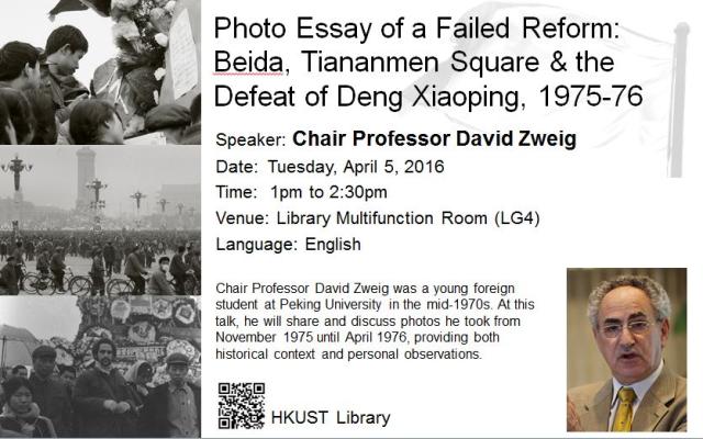 About the TalkProfessor David Zweig was a young foreign student at Peking University in the mid-1970s. At this talk, he will share and discuss photos he took from November 1975 until April 1976, providing both historical context and personal observations. In particular, he will highlight four key points of the political drama:The initial establishment of the Big Character Poster compound at Peking University which attacked Deng Xiaoping’s summer 1975 reform programEmotional outpouring and mourning for Zhou Enlai following his death in January 1976Intensified assault on Deng via the Big Character Posters at Beida in February 1976The mass demonstration of support for ending Maoist policies in Tiananmen in April 3-4, 1976The photo essay is available online in China Perspectives, 2016 (1), p.5-28.About the AuthorDavid Zweig is Chair Professor of Social Science, and Director of the Center on China’s Transnational Relations (CCTR) here at HKUST, where he has worked for the past 20 years, and is a past recipient of the SHSS Outstanding Teaching Award and the RGC’s Prestigious Fellowship (2013-14).His research interests include China’s ‘resource diplomacy’, China’s human resources, Chinese politics and political economy, and Mainland-Hong Kong relations. In addition to many articles and several co-edited books and special journal issues. He has also published 4 books with topics ranging from the Cultural Revolution in the Chinese countryside, rural reform, China’s brain-drain and reverse migration, China’s internationalization, and its relations with oil rich states in the context of the continued global dominance of the US.For enquiries, please contact Victoria Caplan at 2358-6756.