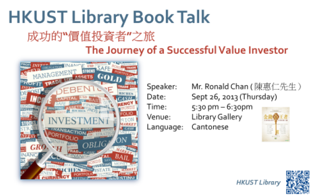 About the Talk"Success in investing doesnt correlate with I.Q. once youre above the level of 125. Once you have ordinary intelligence, what you need is the temperament to control the urges that get other people into trouble in investing." – Warren BuffettOn September 26th, Ronald Chan gave a fun and fascinating talk about value investing as a dynamic and ever-evolving investment strategy. He discussed his recent book "The Value Investors: Lessons from the Worlds Top Fund Managers" (Chinese translation: "金錢王者:全球價值投資大師致勝之鑰"), where he interviewed 12 value-investing legends from around the world to learn how their personal background, culture and life experiences have shaped their investment mindset and strategy.After the Talk, there was a sale of Ronalds books. He very generously donated the sale proceeds to the Library via our "Bookmark Me@UST" program to bookmark his two titles with a bookplate:The Value Investors: Lessons from the Worlds Top Fund ManagersBehind the Berkshire Hathaway Curtain: Lessons from Warren Buffetts Top Business LeadersThe bookplates say:"Never aim to be a person of success, but a person of value!" – Ronald ChanThanks again to Ronald for his generosity. "儘管你的智商指數達到125或以上,對投資成功與否並沒甚麼關連。其實只要擁有一般的智力,勝負關鍵取決於投資態度及自我控制的能力。" – 巴菲特陳惠仁先生在九月二十六日的讀書座談會中,有趣地講解價值投資其實是一個生氣勃勃、不斷演化的投資策略。他在其著作《金錢王者:全球價值投資大師致勝之鑰》(英文原著:《The Value Investors: Lessons from the Worlds Top Fund Managers》)一書中訪問了全球十二位價值投資的傳奇人物,以了解在其投資思維模式及策略的形成過程中,他們的個人背景、文化環境和生活經驗所起的作用。陳惠仁先生在讀書座談會完結後銷售其著作,並將銷售所得全額透過科大"書海留名"計劃捐贈給圖書館。陳惠仁先生在圖書館藏書庫的兩部著作已貼上特別設計的圖書館藏書票:The Value Investors: Lessons from the Worlds Top Fund ManagersBehind the Berkshire Hathaway Curtain: Lessons from Warren Buffetts Top Business Leaders藏書票上印有陳惠仁先生的鼓勵字句:"Never aim to be a person of success, but a person of value!" – Ronald Chan再次感謝陳惠仁先生的參與和支持。 About the SpeakerRonald is the founder and Chief Investment Officer of Chartwell Capital Limited, an investment management company based in Hong Kong. He is a frequent contributor to financial newspapers and magazines in the Asia-Pacific region, and is the author of "The Value Investors: Lessons from the Worlds Top Fund Managers" and "Behind the Berkshire Hathaway Curtain: Lessons from Warren Buffetts Top Business Leaders." Ronald received Bachelor of Science degrees in Finance and Accounting from the Stern School of Business at New York University.陳惠仁先生畢業於紐約大學史登商學院,為香港 Chartwell Capital Limited 投資管理公司的創辦人及投資總裁。陳先生常於亞太區之財經報刊雜誌發表文章,並著有《The Value Investors: Lessons from the Worlds Top Fund Managers》,《Behind the Berkshire Hathaway Curtain: Lessons from Warren Buffetts Top Business Leaders》等書。For enquiries, please contact Celia Cheung at 2358-6768.