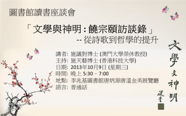 About the TalkProfessor Jao Tsung-I was delighted by the publishing of Professor Sze Yee Tui’s “Literature and God”, and thought it an impossible mission without divine inspiration. That is a question only the author can answer. The book took Prof. Sze more than a decade of researching and writing, and four years of editing. Just as the proverb goes, it takes ten years to grind a sword, so it took just as long to Prof. Sze to perfect every word in the book.Prof. Sze will take us through of how he wrote the book, and what he has learned from Prof. Yao. He will also give us a glimpse into the alluring world of his intellectual journey.本書以訪談形式,深入淺出,全面、系統地對饒宗頤學藝大世界作一概括描述。從橫的角度看,既展示饒公在史學、文學、經學乃至甲骨學、秦簡學、敦煌學諸多領域的獨特見解及建樹,又呈現饒公於詩、詞、文、賦及書法、繪畫、琴藝諸多方面的風貌及成就;從縱的角度看,則於宇宙觀、神學觀、藝術觀以及對世界萬物的認識論,作深入的探索及討論,頗多新創之見。全書正文七章,另有代序、緒論、附編以及饒宗頤學術年表。饒公其人,平易可親;饒公其學,莫測高深。為將饒公之學盡量加以淺析,力求使讀者容易理解,本書編纂,歷十度寒暑,又批閱四載,始畢其功。內容根據錄影、錄音及已刊文集,兩相校核,並依編纂者個人心得,編排、整理而成。是閱讀大師、走近大師的一部入門讀本。施教授的《文學與神明 : 饒宗頤訪談錄》(索書號: PL2264 .R36 2010) 已入館藏,可隨時借閱。 About the AuthorProfessor Emeritus Dr. Yee Tui Sze’s ancestral home was in Changhua County, the Granary of Taiwan. He is a professor and researcher in Chinese literature at the Faculty of Social Science and Humanities at the University of Macau, where he has been teaching classical literature and Chinese poetry (Ci) for more than two decades. He is the winner of several teaching awards, and served as the Associate Dean at the Faculty of Chinese of the University. Prior to the University of Macau, Prof. Sze was the Editor-in-Chief of Hong Kong New Asia Publishing, an Associate Researcher at the Institute of Literature, Chinese Academy of Social Sciences (CASS). Prof. Sze graduated from the Department of Chinese, Fujian Normal University, and went on in pursuit of his postgraduate research at the Centre for Language and Literature Studies of Hangzhou University, obtaining both of his MPhil and PhD in Chinese Literature from the Graduate School of CASS in Beijing. His two great mentors were Prof. Xia Chengtao and Prof. Wu Shichang, both were the leading authorities in Chinese literature. Prof. Sze’s doctoral thesis, Study on the Relationship Between the Lyric and Music, has been regarded by the fellow scholars as the most integrated thesis on Ci for the century, one of the most-highly cited theses of his field. Prof. Sze has further established the theory of Constructive Analysis of Ci based on the foundation laid by Prof. Wu Shichang.Prof. Sze is a prolific researcher whose publications include more than 20 sole-authored books, in addition to numerous articles and papers.施議對, 台灣彰化人。澳門大學榮休教授、中國社會科學院比較文學硏究中心學術顧問、河南大學兼職教授。中國社會科學院文學硏究所原副硏究員、香港新亞洲出版社原總編輯、澳門大學原中文學院副院長、社會科學及人文學院中文系教授。福建師範學院中文系畢業,杭州大學語言文學硏究室硏究生結業。中國社會科學院文學碩士、文學博士。曾師事夏承燾、吳世昌,專攻詞學,頗得真傳。所撰博士論文《詞與音樂關係硏究》,學界譽為近百年來詞學集成之作;並依吳世昌結構分析法,倡為詞體結構論,以示門徑。主要著作有:《詞與音樂關係硏究》《宋詞正體》(《施議對詞學論集》第一卷)、《今詞達變》(《施議對詞學論集》第二卷)、《詞法解賞》(《施議對詞學論集》第三卷)、《人間詞話譯注》《李清照全閱讀》《胡適詞點評》以及《當代詞綜》(四冊)等近二十種。For enquiries, please contact Edwin Leung at 2358-6708.