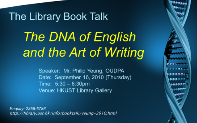 About the BookThe DNA of English and the Art of Writing / by Philip Yeung (Forthcoming: Oxford University Press)There are thousands of books on writing, but this is the first to explore how "cracking the DNA of English" opens up many possibilities to write creatively. This is a book beyond grammar. It redirects our attention to the primary purpose of language learning: to write and to speak with impact.Sharing his writers point of view, Mr. Yeung explained his method that encourages you to look for the functions and patterns of language and discover what makes a piece of writing attractive.He considered issues like:What are the functional implications of English being an alphabetical language?Why do we need nouns, verbs, adjectives adverbs, and prepositions?How do sounds generated alphabetically offer possibilities for memorable writing?What areas cause non-native writers to stumble, and why?He also discussed how studying presidential speech writers helped him develop a formula for powerful writing. Whether you are a new writer or an experienced one, Mr. Yeungs talk had something to offer everyone.The DNA of English and the art of writing [streaming video].Power Point Presentation About the AuthorMr. Philip Yeung is speechwriter to the President of HKUST and Senior Communication Manager at the Office of University Development and Public Affairs. He was formerly a freelance speechwriter to many Hong Kong leaders, including the current Financial Secretary and the Secretary for Financial Services and the Treasury. He was a frequent contributor to the South China Morning Post on English language and education issues, and has delivered effective writing workshops to undergraduate and postgraduate students.Mr. Yeung completed his undergraduate and graduate education at the University of Toronto and studied briefly at Exeter College, Oxford University on a scholarship.In addition to his forthcoming book, The DNA of English and the Art of Writing, he has several other books in preparation: Winning over your Audience: The Neglected Art of Speaking with Impact, Empowerment English for the Disadvantaged, and English for Global Citizens.For enquiry, please contact Victoria Caplan at 2358-6786.