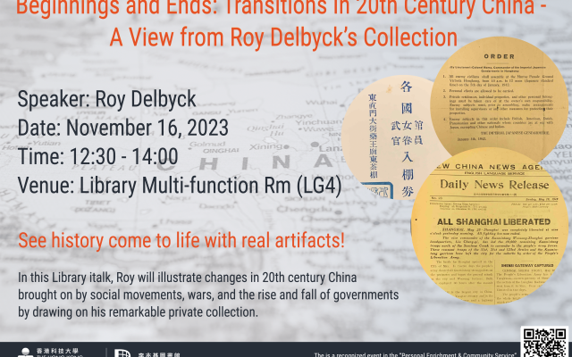 About the Talk:See history come to life with real artifacts! In this talk, Roy will illustrate changes in 20th century China brought on by social movements, wars, and the rise and fall of governments by drawing on his remarkable private collection of books, maps, diaries, letters, photographs, posters, programs and tickets (and all other manner of "ephemera").Among other items, Roy will discuss (and bring with him):Tickets to the 1908 funeral procession of the Empress Dowager Cixi in PekingPhotos of the 1911 Wuchang UprisingA Chinese Labour Corps HR manual from France in 19171930s New Life movement postersInternee artifacts from WW2 Japanese prison camps in China and Hong KongThe May 1949 New China News Agency article announcing the capture of Shanghai by Communist troopsThe last issue of the North China Daily News in March 1951. Registration: https://lbcube.hkust.edu.hk/ce/event/9824 Notes: The talk will be recorded and photos will be taken during the talk.This is a HMAW1905-recognized event in the "Personal Enrichment & Community Service" category under the "Self-directed Experience" of HMAW1905: Behavioral Foundations of University Education: Habits, Mindsets, and Wellness.To receive 1.5 hour, you must attend the event in full and miss no more than 10mins. About the Speaker:Roy is no stranger to HKUST. He has spoken at HKUST several times, most recently in 2018. Roy has addressed groups and institutions all over Hong Kong and in the US and China as well. When not collecting, Roy is a customs and trade lawyer with his own firm in Hong Kong. He is on the Council of the Royal Asiatic Society Hong Kong and a member of the Board of Trustees of the Museum of Chinese in America located in New York City. Roy was recently profiled in the Sunday magazine of the South China Morning Post and interviewed for the RTHK radio program Hong Kong Heritage.
