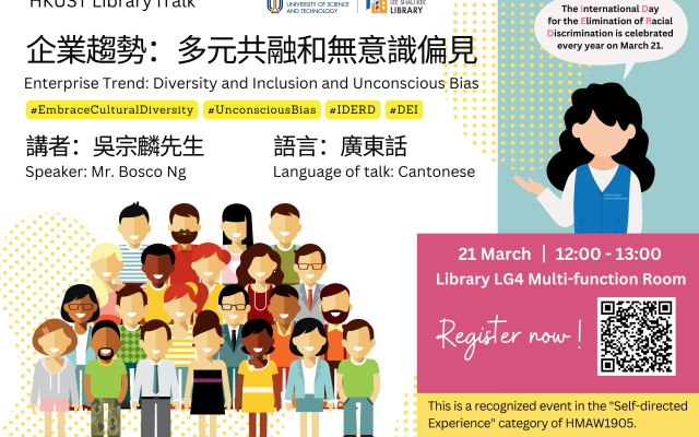 簡介/Description吳宗麟先生將分享他或他的團隊在執行培訓和活動時遇到的真實案例。參與者將能夠更加了解無意識偏見 (unconscious bias ) 以及減少/消除它的方法。Mr. Ng will share about the real case examples which he or his team have encountered when they conduct their training and activities. Participants will be able to understand more about unconscious bias and the methods to reduce/ eliminate it. Registration: https://lbcube.hkust.edu.hk/ce/index.php/event/9970-2/Notes: This is a HMAW1905-recognized event in the "Personal Enrichment & Community Service" category under the "Self-directed Experience" of HMAW1905: Behavioral Foundations of University Education: Habits, Mindsets, and Wellness.To receive 1.0 hours, you must attend the event in full and miss no more than 10mins.The talk will be recorded and photos will be taken during the talk. By attending or participating in this event, you are giving your consent to be photographed and video recorded and you are waiving any and all claims regarding the use of your image by the University. 作者簡介 / About the speaker:吳宗麟先生 (Mr. Bosco Ng) 是一家屢獲殊榮的社會企業 愛同行 (WEDO GLOBAL) 的創辦人,愛同行 (WEDO GLOBAL) 旨在倡導多元文化和全球化教育。Bosco 擁有為亞洲各行業設計和開展培訓項目的豐富經驗,培訓主題涵蓋社會創新與創業、多元共融、文化智商、設計思考等。 他現為僱員再培訓局 (ERB) 課程發展及審批委員會成員,負責制定及定期檢討本港近30個產業發展培訓課程的方向及策略。此外,他獲平等機會委員會委任為「種族平等共融顧問委員會」成員,致力促進香港的多元文化和種族共融。為表揚他對香港的貢獻, Bosco 榮獲香港青年服務大獎及青年夢想實踐家等殊榮。Mr. Bosco Ng is the Founder of WEDO GLOBAL, an award-winning social enterprise that aims to advocate multicultural and global-minded education.Note: 聯合國大會在1966年10月26日通過的2142號決議,宣布每年的3月21日為國際消除種族歧視日 (International Day for the Elimination of Racial Discrimination)。