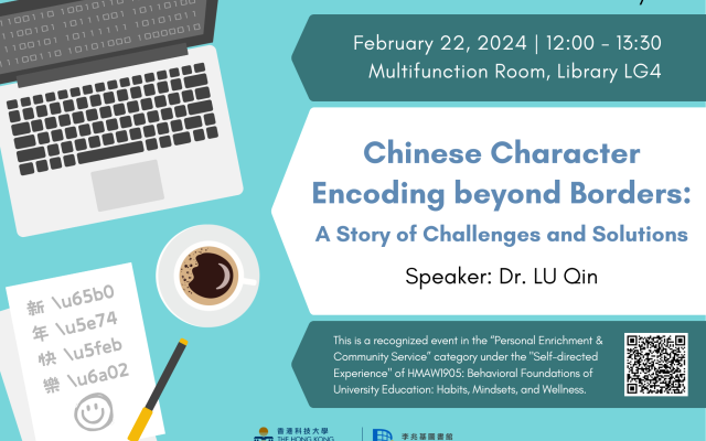 About the TalkEver wondered how Chinese characters can be seamlessly typed, searched, and read on computers? Curious about the story of how Chinese, Japanese, and Korean (CJK) characters integrated into our digital world? Join us as we explore the evolution of CJK encoding and the challenges it has overcome!Over the past 30 years, Unicode has revolutionized information exchange & storage across languages, bridging gaps between different systems and enabling seamless communication beyond borders. Thanks to this universal character encoding standard, global digital communication today is more inclusive and accessible.However, the situation is far from simple. Encoding the vast number of Han characters (漢字) used in Chinese, Japanese, Korean, and other languages has always been a major challenge. Unlike alphabets with fixed character sets, the collection of Han characters is constantly expanding. This requires careful consideration to accommodate new characters within existing technology. These characters also have variant forms due to their long history and evolution. Information systems face a dilemma between maintaining consistency in variant forms and preserving historical works. Striking the right balance is crucial for academic research and digital preservation.In this talk, Prof. Qin LU will introduce the history of making CJK encoding work across borders, languages, and systems. She will discuss the technical challenges faced and share the development of ingenious solutions that address them. Come and join us to uncover the magic behind language and technology.Registration: https://lbcube.hkust.edu.hk/ce/index.php/event/9921/ Please Note:This is a HMAW1905-recognized event in the "Personal Enrichment & Community Service" category under the "Self-directed Experience" of HMAW1905: Behavioral Foundations of University Education: Habits, Mindsets, and Wellness.To receive 1.5 hour, you must attend the event in full and miss no more than 10mins.The talk will be recorded and photos will be taken during the talk. By attending or participating in this event, you are giving your consent to be photographed and video recorded and you are waiving any and all claims regarding the use of your image by the University. About the SpeakerDr. LU Qin is a leading expert in open systems and CJK encoding methods. She initiated the I-Hanzix open system architecture to support multiple locales and also engineered the code set announcement scheme making it possible to display web pages written in different languages in their native forms across the web. She spearheaded the development of Hong Kong’s first standard of Chinese character set, Hong Kong Supplementary Character Set, used in all systems in Hong Kong and played a leading role in pushing Hong Kong to migrate to ISO10646/Unicode platform.She continues to be very active in CJK standardization work. Since 2004 she has served as the convenor of the ISO/IEC JTC1/SC2/WG2/IRG group for the encoding of CJK unified ideographs in the ISO 10646/Unicode standards and is a contributing editor to the Unicode standard.In 2012, she received a Medal of Honour from the Hong Kong government and in 2015 she was awarded the Bulldog Award from Unicode for her contributions as an expert in CJK encoding. Until her retirement, Prof. Lu was a professor at Department of Computing, the Hong Kong Polytechnic University.Prof. LU received her B.S. in electrical engineering from Beijing Normal University and her M.Sci. and Ph.D. in computer science from University of Illinois Urbana-Champaign. ____________________________________________Learn more: Unicode Consortium Overview video (5 min.)