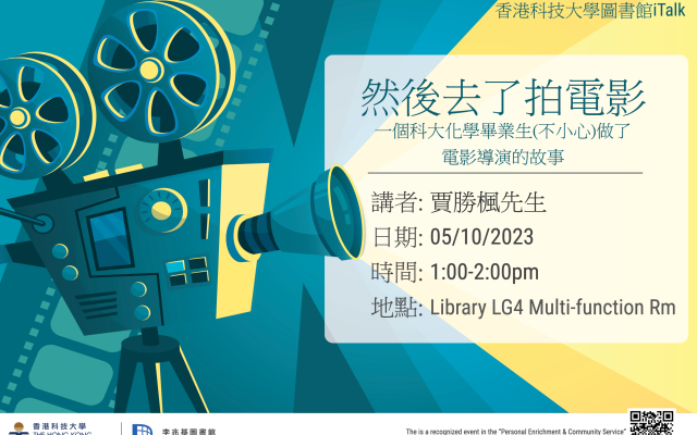 座談會簡介十幾年前,賈勝楓在科大讀化學系。然後,去了拍電影。 這次分享,就是想說中間發生了什麼事。 敬請留意一個化學生(不小心)做了電影導演的故事。是次講座將以實體形式進行,名額有限,請從速報名。 Notes:The talk will be recorded and photos will be taken during the talk.This is a HMAW1905-recognized event in the "Personal Enrichment & Community Service" category under the "Self-directed Experience" of HMAW1905: Behavioral Foundations of University Education: Habits, Mindsets, and Wellness.To receive 1.0 hour, you must attend the event in full and miss no more than 10mins.賈勝楓2004年入讀科大,主修化學。畢業後曾任記者。2017年開始拍攝不同類型的影片,包括紀錄片、劇情短片、音樂微 電影等。2017年拍攝的紀錄短片《粥店日與夜》獲得新加坡傳媒出版聯會(MPAS) 頒發年度最佳影片;2018年編導鮮浪潮競賽短片《飛往父親的鳥》,同年與比利時導演Kato De Boeck合導同屆鮮浪潮閉幕影片《雞蛋仔》;2019 年編導音樂微電影《小巴1043天》,獲得第七屆「創+作」最佳編劇、最佳製作銀奬及最佳男演員銀奬;2020年編導音樂微電影《埋單》。2019年以聯合編劇及導演身份參加第六屆「首部劇情電影計劃」,作品《流水落花》成為得獎項目,2022年完成後製,2023年3月上映。