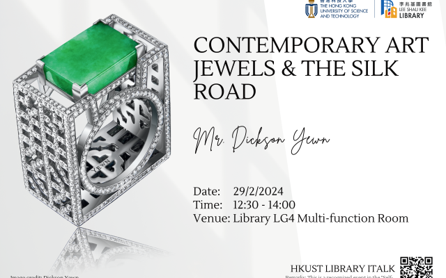 About the Talk:Jewellery is an ancient art form, using skill to combine elements like gold or silver with precious stones like jade to create beautiful forms to adorn ourselves. The significance of jewellery goes beyond its physical form, to how it is perceived, worn, and connected to surrounding artifacts and symbols.In this talk, Mr. Dickson Yewn will share on his work to use and celebrate the heritage of traditional Chinese jewellery in making modern wearable art. He will discuss his work to link people to the past through jewellery, bridging the past and the present, recalling China’s history and fashion through images, and offer a unique aesthetic journey. About the Speaker:Since childhood, Mr. Dickson Yewn has devoted himself to fine arts and felt a strong affinity to Chinese arts and culture. Starting 1995, he launched a jewellery brand, “Life of Circle”. After selling that brand to a listed company, in 2007, he launched a new brand under his own family name, YEWN, and opened its flagship store in The Landmark Central.In 2022, Mr. Yewn published the first of two volumes edition of the first contemporary Chinese jewellery art books in the world, entitled Contemporary Art Jewels and The Silk Road.An artist, an entrepreneur, and a literatus, Mr. Yewn is currently also currently a postgraduate student in the School of Humanities and Social Science at HKUST. Registration: https://lbcube.hkust.edu.hk/ce/event/9970 Notes:This is a HMAW1905-recognized event in the “Personal Enrichment & Community Service” category under the “Self-directed Experience” of HMAW1905: Behavioral Foundations of University Education: Habits, Mindsets, and Wellness.To receive 1.5 hours, you must attend the event in full and miss no more than 10mins.The talk will be recorded and photos will be taken during the talk. By attending or participating in this event, you are giving your consent to be photographed and video recorded and you are waiving any and all claims regarding the use of your image by the University.