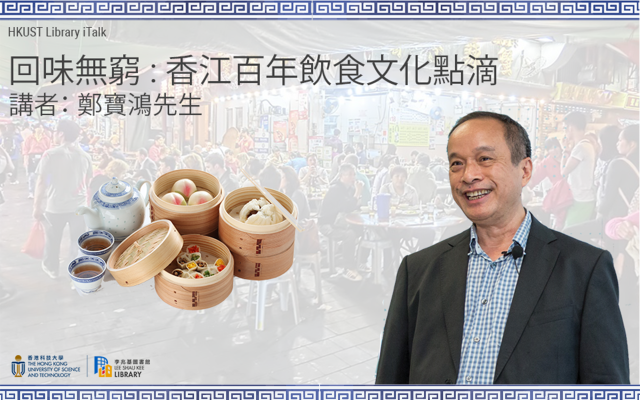 座談會簡介圖書館五月的iTalk,邀請了香港歷史愛好者兼收藏家鄭寶鴻先生分享香港往昔多姿多采的飲食文化。鄭先生將透過多幅珍貴的舊照片,細談香港百多年來令人勾起無窮回憶、卻已消失的美食,以及簡述不同食肆的始末及演變,讓大家了解香港不同時期市民的飲食潮流。其近作包括《回味無窮 : 香港百年美食佳餚》及《香江知味 : 香港百年飲食場所》,將於講座即場發售 (付款方式:現金或PayMe),歡迎參加者向鄭先生索取親筆簽名。是次講座將以實體形式進行,名額有限,請從速報名(https://lbcube.hkust.edu.hk/ce/event/9375)。The talk will be recorded and photos will be taken during the talk.This is a recognized event in the “Self-directed Experience” component of CORE1905: Behavioral Foundations of University Education: Habits, Mindsets, and Wellness. You need to attend the event in full to get 1.5 hours. 講者簡介鄭寶鴻於一九四零年代末出生,是香港歷史愛好者,錢幣、郵票、歷史照片、明信片等的收藏家,對香港殖民地時期、日治時期的歷史及文化、地方誌等有專家級的認識,常獲不同機構邀請主講有關香港歷史掌故題材的講座。現為香港歷史博物館、香港文化博物館及香港大學美術博物館名譽顧問、香港錢幣研究會副會長兼義務秘書、香港郵票錢幣商會副會長及香港收藏家協會名譽顧問。出版著作:《回味無窮 : 香港百年美食佳餚》、《香江知味 : 香港百年飲食場所 》、《馬照跑舞照跳 : 百年香港的娛樂遣興》、《觸景生情 : 幾代香港人的生活記憶 》等 (https://lbdiscover.hkust.edu.hk/search/a?SEARCH=鄭寶鴻)。