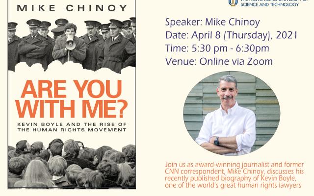 About this iTalkIn this talk, award-winning journalist and former CNN correspondent, Mike Chinoy will discuss the biography he has written about Kevin Boyle (1943-2010), one of the world’s great human rights lawyers. In a career as a lawyer and academic, starting in Northern Ireland in the 1960s, across decades and continents, Boyle worked on issues ranging from freedom of the press to the rights of minorities (ethnic, religious, and sexual) and more. Kevin Boyle was a charismatic, influential figure: a great lawyer, scholar, and mentor whose fascinating life story deserves to be better known. This talk will be a great opportunity to learn about Boyle’s remarkable career and his lasting and extensive legacy.HKUST Library has both a paper copy and an e-copy of the book, Are You with Me: Kevin Boyle and the Rise of the Human Rights MovementAnyone interested in buying a signed copy of the book can contact Mike Chinoy at mikechinoy@gmail.com. Copies are HK$250 each.Registration: https://lbcube.ust.hk/ce/event/7830Notes:The talk will be recorded and photos will be taken during the talk.Students may attain 1.0 hour credit for the HLTH1010 Healthy Lifestyle Course "Wellness and Personal Enrichment" moduleZoom meeting ID and passcode will be sent to registrants at 5pm, 1 day before the talk.Enquiries: Victoria Caplan (lbcaplan@ust.hk) About the SpeakerAs a foreign correspondent for CNN for 24 years, Mike Chinoy won Emmy, Peabody and Dupont awards for his journalism. While he worked primarily in China and North Korea, he also reported on the Troubles in Northern Ireland in the 1970s and 80s. It was during this time that he met Kevin Boyle. Chinoy is currently a Non-Resident Senior Fellow at the University of Southern California’s US-China Institute and is based in Hong Kong. His books include China Live: People, Power, and Television Revolution (1999), Meltdown: The Inside Story of the North Korean Nuclear Crisis (2008), and The Last POW (2014).