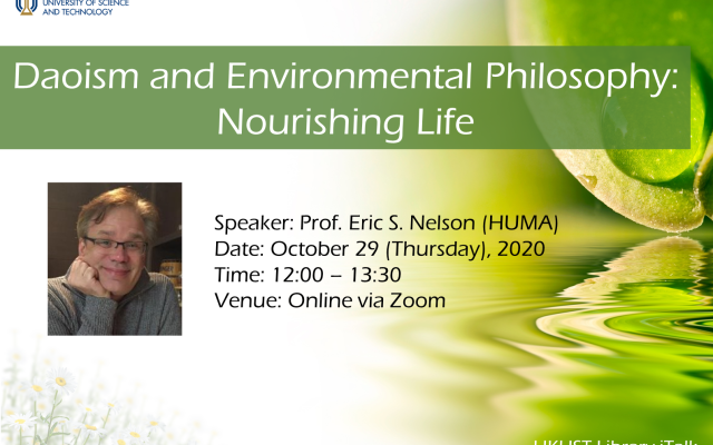 About the Talk - Powerpoint slidesDaoism and Environmental Philosophy: Nourishing Life (Register here)The early Daoist text the Daodejing is popularly and anachronistically thought to speak in direct ways to ecology and the environment. Such prevalent ways of reading the text persist even as they are frequently criticized in the Sinological and Daoist scholarly community. While the Daodejing was composed across different historical contexts with diverse purposes in mind, the text continues to speak to questions of how to individually and socially live and interact with human and inhuman life and the natural world.In discussing my new book Daoism and Environmental Philosophy: Nourishing Life, I reexamine the extent to which the Daodejing and other early Daoist texts can be suggestive for addressing the contemporary environmental crisis. I consider whether and how early Daoist conceptions and practices of emptying (xu 虛), stilling (jing 靜), and making plain (su 素), responsive attunement (wuwei 無為), and nourishing life (yangsheng 養生 ) can be interpreted and reimagined in critical ecological models that indicate different more nurturing ways of dwelling and becoming with our environment and the myriad things (wanwu 萬物), in their own respective tendencies and ways of becoming (ziran 自然). Notes: (i)HLTH 1010 - HKUST students may attain 1.5 hours credit for the Healthy Lifestyle Course after attending the talk. (ii)This event will be recorded using video and photography. About the SpeakerEric S. Nelson is Associate Professor of Humanities at the Hong Kong University of Science and Technology, having joined in 2014. He received his PhD from Emory University. His areas of teaching and research include modern European, East Asian, and intercultural/comparative philosophy and religion. He is particularly interested in questions of communication, interpretation, and social interaction (hermeneutics and ethics). His other book, Chinese and Buddhist Philosophy in Early Twentieth-Century German Thought, was published in 2017 and he has published over seventy articles and book chapters on Chinese, German, and Jewish philosophy.