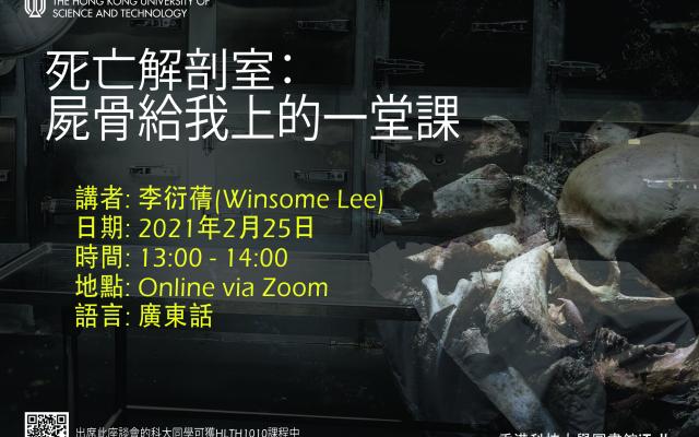 座談會簡介解剖室是法醫科人員經常要到的地方,在那裡可以了解到屍體死時的經歷,尤其對於法醫人類學家來說更可以知道死者生前一生的體驗。但對李衍蒨來說,除了是學會屍體的經歷、故事之外,更重要的是他們藉著死亡、他們的一生讓她學會了一些畢生受用的道理。對她來說在解剖室裡面,就是她對生命及死亡體驗的一段修行,而教會她這些的都是無聲證人、墓地裡面的每一塊骨頭,每一位亡者! 講者:李衍蒨女士 (Ms. Winsome Lee)美國俄勒岡大學哲學學士(學系榮譽畢業生)及香港中文大學人類學文學碩士,於美國邁阿密殮房及相關機構完成實習工作。隨後於英國攻讀法證學及鑑證科學研究碩士,主修法醫人類學,期間於東帝汶法證科擔任法醫人類學家及顧問,處理無人認領的人體殘骸。除此之外,亦先後到波蘭進行生物考古學、法醫人類學及法醫考古學研究,以及於塞浦路斯項目擔任助理顧問。2016及2017年分別開始於《立場新聞》及CUP媒體平台定期撰寫有關法醫學及法醫人類學的文章。2017年開設「The Bone Room。存骨房」facebook專頁,以雙語形式分享世界各地的法醫人類學及法證專業的有關資訊。2019年於香港電台第一台主持《法醫研究所》節目。第一本由台灣出版的著作《存骨房》亦已於2020年2月6日於台灣面世。 出席此座談會的同學可獲 HLTH1010 中 “Wellness and Personal Enrichment” 單元 1小時學習時數講座將使用視頻和攝影記錄Zoom meeting ID 和 passcode會在講座前1天下午5點電郵通知已報名的同學和同事 報名請往 https://lbcube.ust.hk/ce/event/7649 如有查詢,請聯絡 Ms. Eunice Wong (lbeunice@ust.hk)。
