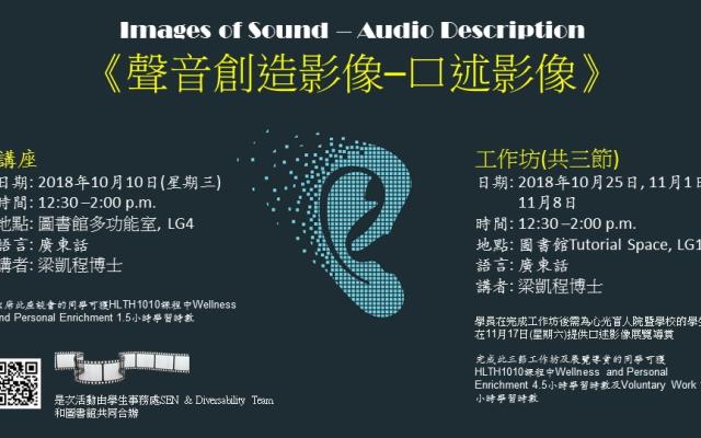 You are cordially invited to join “Images of Sound – Audio Description” talk by Dr. Dawning Leung.The talk is co-organized by the Student Affairs Office SEN and Diversability Team and the Lee Shau Kee Library.學生事務處特殊教育需要及多元共融小組 和圖書館誠意邀請你參加由梁凱程博士主講的《聲音創造影像 – 口述影像》講座。講座簡介口述影像是什麼?口述影像與視障人士不同類型的口述影像服務成為專業口述影像員的條件口述影像體驗 講座外另設工作坊工作坊簡介內容針對基本展覽口述影像技巧,目標:讓學員認識視障人士的需要及如何和他們溝通讓學員掌握基本口述影像技巧為學員提供口述影像示範教授學員撰寫口述影像稿件 教授學員糸何將口述影像技巧應用於展覽上,協助視障人士理解日期: 2018年10月25日 (星期四),2018年11月1日 (星期四),2018年11月8日 (星期四)時間: 12:30 – 2:00 p.m.地點: 李兆基圖書館 Tutorial Spaces, LG1語言: 廣東話敬備茶點招待學員在完成工作坊後需為心光盲人院暨學校的學生在11月17日星期六提供口述影像展覽導賞 口述影像展覽導賞日期: 2018年11月17日 (星期六)時間: 10:00 – 11:30 a.m.地點:李兆基圖書館香港潮州商會高佩璇展閱廳, 1/F語言: 廣東話完成此工作坊及展覽導賞的同學可獲HLTH1010課程中Wellness and Personal Enrichment 4.5小時學習時數及Voluntary Work 1.5小時學習時數工作坊及展覽導賞報名成功報名的同學需要先付按金港幣 $50元,完成工作坊及展覽導賞後全數退還。 講者簡介梁凱程博士 為香港口述影像協會創辦人及行政總監 ,於英國倫敦大學學院(University College London)取得博士學位,她的博士論文是全球首個廣東話口述影像的研究。梁博士是資深口述影像員及無障礙顧問,致力推廣口述影像及培訓口述影像員,協助視障人士参與多元化文化活動接觸世界,促進社會共融。梁博士具豐富口述影像實踐及培訓經驗,曾為不同類型的活動提供口述影像服務,包括:電影、電視節目、展覽、舞台劇、表演和戶外活動,如:世界盃賽事和盲人觀星營等等。服務對象包括港澳盲人機構、政府部門、大學、中學、電影節、博物館等等。如有查詢,請聯絡 Eunice Wong (lbeunice@ust.hk)。香港科技大學圖書館