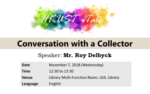 About the TalkRoy Delbyck is a major collector of printed materials on China and Hong Kong, largely from the first half of the 20th century. His collection comprises books, maps, photographs, letters, diaries, posters, postcards, directories, and other ephemera. It continues to grow, daily!Roy will talk about what he collects, he will also speak on why he collects, how his collecting interests have changed over time while exploring the nature of collecting, and how private collectors fill in the gaps, often going where institutions can’t.About the SpeakerWhen not collecting, Roy Delbyck is a US customs and trade lawyer with his own firm. He has resided in Hong Kong for many years. He is a trustee of the Museum of Chinese in America based in New York City.Roy has spoken on collecting and his collections at the Royal Asiatic Society, The University of Hong Kong, City University of Hong Kong and the Yale Club of Hong Kong. Photographs from his collection were exhibited at HKUST Library earlier this year.To register, go here https://lbcube.ust.hk/ce/index.php/event/5921/Students may attain 1-hour credit for the Healthy Lifestyle Course after attending the talk.