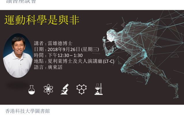 座談會簡介現今互聯網世界資訊氾濫,內容是真是假?很多人不再理會,於是造就不少錯誤訊息廣泛流傳,情況越來越嚴重。近年運動熱潮的興起,不少人把信以為真的訊息在網上與人分享,當中有些資訊更是錯誤的,以訛傳訛,越傳越錯,對社會容易造成負面影響。雷雄德博士將在是次座談會上為我們拆解運動的謬誤,提供一些運動冷知識,讓大家能夠更了解運動的科學原理。既可提升運動表現,享受運動樂趣的同時,也有助減低受傷的風險。《請問雷博士!運動科學是與非》是雷博士於2017年出版的作品。此書將於座談會即場發售,歡迎向作者索取親筆簽名。出席此座談會的科大同學可獲HLTH1010課程中"Activities"單元的"Wellness and Personal Enrichment"1小時學習時數。同學須於入場及離場時出示學生證以作記錄。名額有限,歡迎校外人士參加,請各位報名留座。如有查詢,請聯絡Ms. Celia Cheung (lbcelia@ust.hk)。講者簡介雷雄德博士畢業於美國麻省春田大學,考獲理碩士及體育博士學位,主修體育及運動科學。現職香港浸會大學體育學系副教授,兼任浸會大學許士芬博士體康研究中心副主任,及「亞洲體康學報」編輯。「運動與健康」和「學童體質」是雷博士的主要研究領域,曾撰寫八十多份學術文章及研究報告,並於國際學術會議上發表;社區服務方面,現兼任香港運動醫學及科學學會會長、香港警察訓練學院名譽顧問、小童群益會團隊挑戰賽主委、香港電台顧問團委員等;先後為明報、經濟日報、蘋果日報及星島日報撰寫專欄文章;連續於2002-2013年度獲得香港教練培訓委員會「優質教學獎」;每星期定期為香港電台主持體育及健康節目。