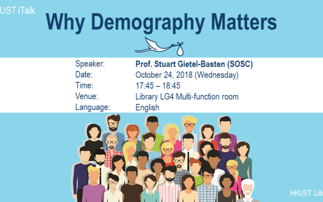 About the Talk:Discussion of demography traditionally has focused on the consequences of population growth. In the talk, Prof Gietel-Basten will share his insights on how our understanding of demographics can influence politics and populations. He will also suggest how humans can take greater ownership of the future by a better understanding of the role demography has played in the past.You can register at Library Event Registration HLTH1010 HKUST students may attain 1.0 hour credit for the Healthy Lifestyle Course after attending the seminar.About the SpeakerProf Stuart Gietel-Basten is Associate Director of the Leadership and Public Policy Executive Education Program, and an Associate Professor of Department of Social Science and Institute for Public Policy at HKUST.His research covers the links between population and policy, with a regional focus on Asia. He is especially interested in the emergence of low fertility across the region, and the consequences of this in terms of population ageing and growth. He has been published in a number of major journals in demography and other social science subjects. Why Demography matters (co-written with Danny Dorling) is his first book. He is also a regular contributor to the South China Morning Post and the China Daily.He received his education at the University of Cambridge, with a PhD in historical demography. Before coming to HKUST, he was an Associate Professor of Social Policy at the University of Oxford. He has also been an adviser in Population and Development at the UK Parliamentary Office for Science and Technology and a Research Scholar at the International Institute of Applied Systems Analysis in Austria.