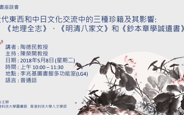 座談會簡介在近代東西和中日文化交流中, 三種珍籍曾有過不凡的經歷。在上海的倫敦佈道會傳教士慕維廉編纂的《地理全志》(1853-54)被日本幕府外交官岩瀨忠震所珍重並改編為易於檢索的《瀛環表》; 日本史學家星野恆先於中國人編成的《明清八家文》(1880)得到了應邀訪日的香港名士王韜的詳細評點; 1919年內藤湖南依據從上海新購入的孫廷翰舊藏《鈔本章學誠遺書》首先撰寫了章氏年譜, 給北京大學的胡適和清華大學的姚名達以極大刺激,二人隨之撰寫並增補了自己的章氏年譜。這三種珍籍經過講者的考證和推薦分別由日本関西大學出版部, 北京中華書局和台湾大學人文社会高等研究院影印出版。座談會將由香港科技大學圖書館和香港科技大學人文學部聯合主辦。名額有限,歡迎校外人士參加,請各位報名留座。如有查詢,請聯络Ms. Alice Ho (852) 2358-6707 / lbalice@ust.hk.About the SpeakerBorn and raised in Shanghai, De-min Tao has been a book lover since his boyhood. He had a hobby to roam about new and second-hand bookstores on Sichuan Road and Nanjing Road to find books and dictionaries he liked. But the “Proletarian Cultural Revolution” of 1966-76 disturbed his dream to read valuable books extensively to enrich himself while young. After the disastrous time, he was fortunate to be able to get a normal education and earn his MA from Fudan University and Ph.D. from Osaka University, and taught at Bridgewater State College of Massachusetts in early 1990s after finishing postdoctoral research at Princeton’s East Asian Department and Harvards Reischauer Institute of Japanese Studies. During his teaching career at Kansai University (founded 1886) since 1996, he served as director of Institute for Cultural Interaction Studies at Kansai University (2007-12), a government-sponsored G-COE (Global Center of Excellence) program, and as the founding president of International Society for Cultural Interaction in East Asia (2009-10), whose 10th annual meeting is going to be held at City University of Hong Kong on 12th and 13th of May.Out of his own expectation, he became now an author and editor of 50 books (including coauthored and coedited ones), such as Cultural Interaction Studies in East Asia: New Methods and Perspectives; Transpacific Relations in the Late 19th and Early 20th Centuries: Religion, Commerce, and Culture; The Global Lincoln; The World Expositions and the East Asian Participation 1851-2010; The Collected Works of Samuel Wells Williams; Naito Konan’s Collection of Calligraphic and Pictorial Works of the Late Qing Celebrities; Neo-Confucianism and East Asia in Early Modern and Modern Eras, and so forth.For details of some of his works, please refer to his pages on Amazon China and Amzaon Japan. 講者簡介生在上海長在上海的陶德民,自小就是一個讀書愛好者。他喜歡閒逛離家不遠的四川路和南京路上的新書店和舊書店,買他想要的圖書和辭典。可是,1966年開始的“無產階級文化大革命”,使他趁著年輕多讀好書來充實自己的夢想無法成真。所幸的是,動亂結束后他有機會接受師範教育,並在復旦大學獲得碩士,在日本大阪大學獲得博士學位。1990年代前期,在普林斯頓大學東亞系和哈佛大學賴肖爾日本研究所完成博士後研究工作后,他在麻省州立橋水學院執教四年。從1996年迄今,他在關西大學任教已有二十餘年,其間2007年至2012年擔任該校東亞文化交涉學教育研究中心主任,該中心是日本文部科學省重點資助的全球化卓越中心計劃項目。他也是2009年成立的國際東亞文化交涉學會的創會會長,該學會的第十屆年會將於今年5月12、13日在香港城市大學舉行。他自己也沒有想到,經過多年努力,現在已經成為50本書(包括合著和合編的在內)的作者和編者。這些著作包括: Cultural Interaction Studies in East Asia: New Methods and Perspectives; Transpacific Relations in the Late 19th and Early 20th Centuries: Religion, Commerce, and Culture;The Global Lincoln; 《世博會和東亞的參與》,《衛三畏文集》,《內藤湖南と清人書畫》及《朱子學と近世近代の東アジア》……等等。關於他的部分編著,可以從亞馬遜的中文和日文網頁上了解詳情。