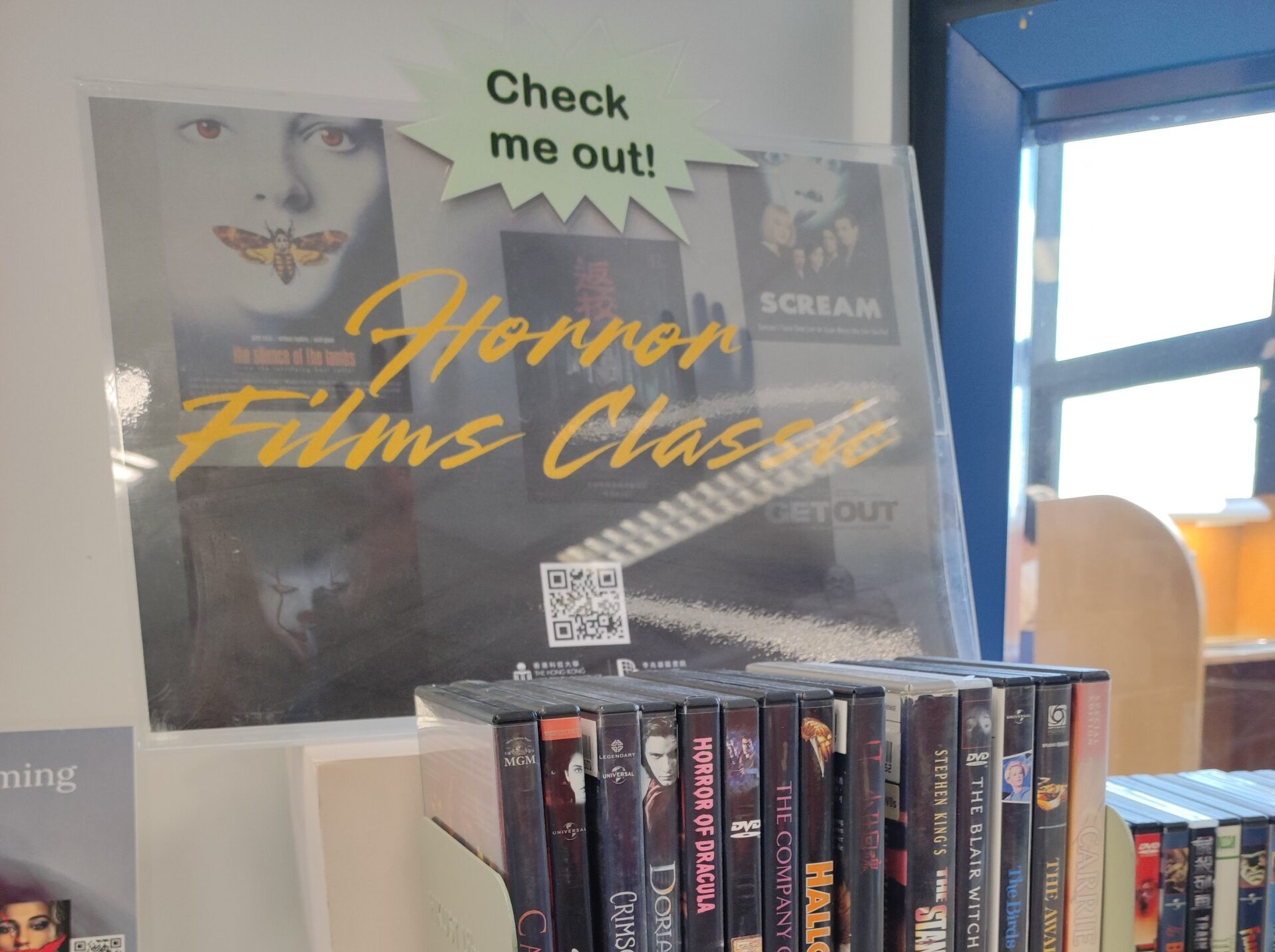 Hey students and staff! Ready for some thrills? Our new horror film display, featuring over 100 DVDs, is here to get you excited! Whether you are looking for a good scare or a creepy vibe for a cozy movie night, we have got you covered. From classic thrillers like The Shining to modern favorites like Get Out and Longlegs, the display offers something for every horror fan. Don’t miss our selection of Asian titles, such as the iconic 呪怨  (Ju-on) and the must-see Korean zombie flick 부산행 (Train to Busan). If you want some laughs mixed with chills, カメラを止めるな! (One Cut of the Dead) is a must-watch! We are also featuring 5 streaming films, including Smile 2 and Summer of 84. Grab your friends and get ready for a spooky good time! These films are perfect for getting into the Halloween spirit or taking a thrilling break from studying.