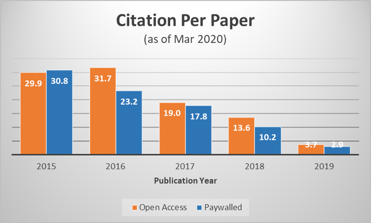 The chart shows the citation count per paper of the two groups: OA papers and Paywalled papers. Except the batch of 2015 publications, in general OA papers have higher citation count per paper. One can say that an average OA paper gets more citations than an average paywalled paper. For example, among the papers published in 2018, an OA paper gets about 3 more citations than a paywalled one.