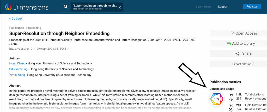 Dimensions database contains records of many types, including publications, patents, clinical trials, policy documents and grants. The basic search within publications is free to use. Searching for other document types requires subscription. Once you open a record of a paper, you can see the citation count at the "Dimensions Badge" (Figure 5); when you display the citing references, you can export the list (Figure 6).