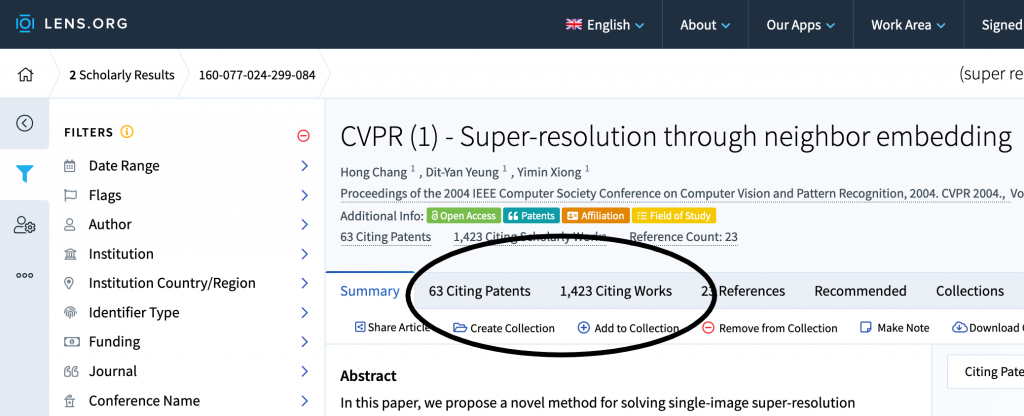 Lens is a free resource that provides a lot of interesting functions for exploring research literature. It contains patent records, and integrates scholarly records from multiple sources: