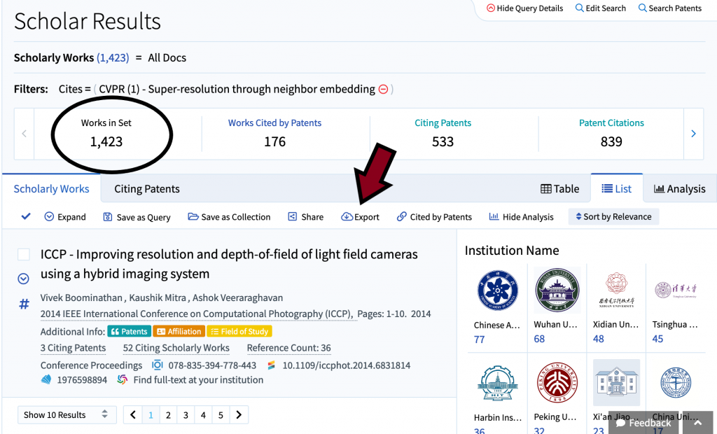 Since MA is a data source of Lens, we can expect that what we can find in MA can also be found in Lens. Lens show you citing references from patents as well as scholarly works (Figure 3). When you display the citing works, you can use the export function to extract the records in bulk (Figure 4).